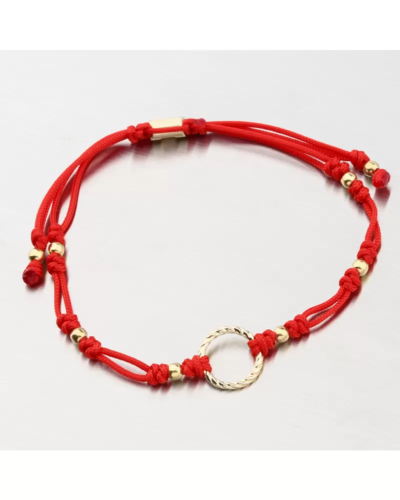 Veľmi obľúbený typ špagátového náramku, ktorý má výhodu vo svojej univerzálnej veľkosti a obľúbenej červeno-zlatej kombinácii farieb. tvaru zakrúteného kruhu.