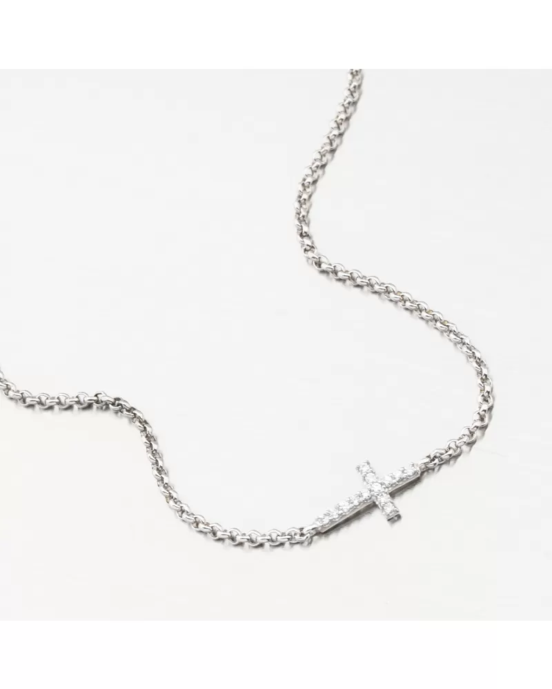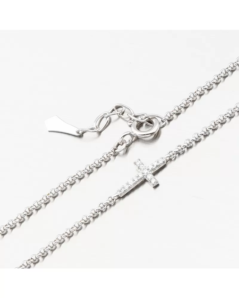 Jemný náramok bieleho zlata pozostáva z veľmi pohodlnej reťazca a jemného prívesku v tvare kríža. Kríž je presne vysadený zirkónmi v brilantnom strihu. Brilantný strih dáva zirkónom trblietky skutočných diamantov. Náramok je veľmi príjemný na každodenné nosenie. Dĺžka náramku je 16 cm s použitím 2 cm dlhého reťazca, je možné zapnúť náramok v dĺžke 16 až 18 cm. Nastaviteľná dĺžka má úžasnú výhodu v tom, že nemusíte poznať presnú veľkosť a darovaná osoba prispôsobuje samotnú dĺžku. Pripevnenie je na vtákovi.