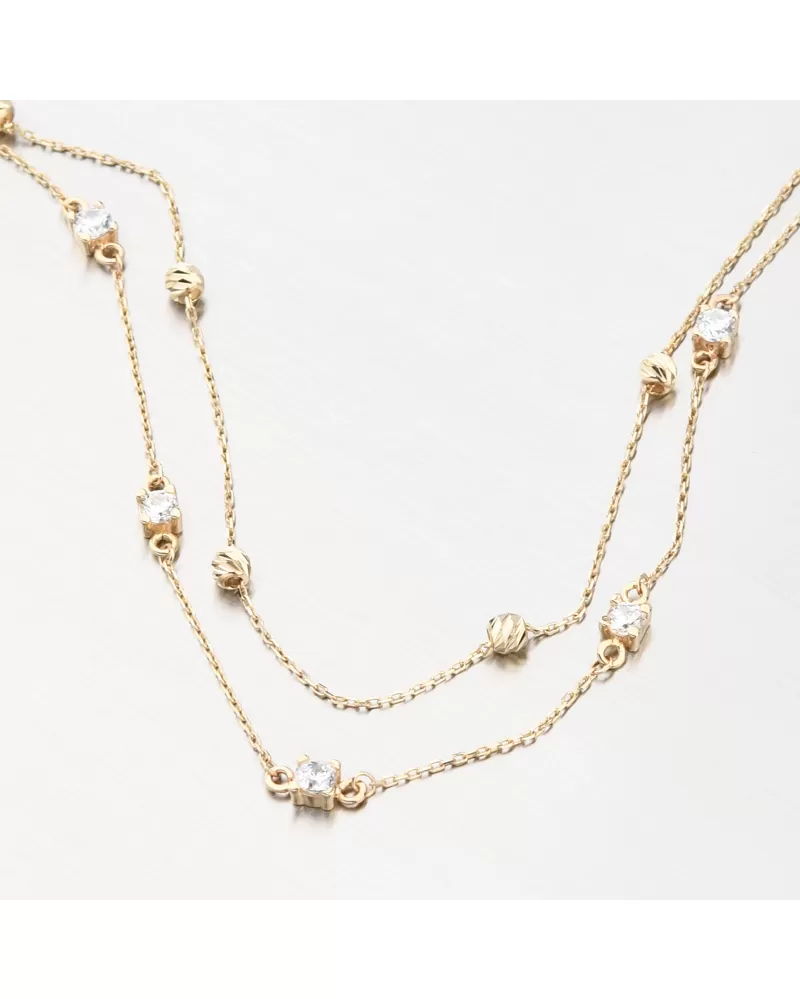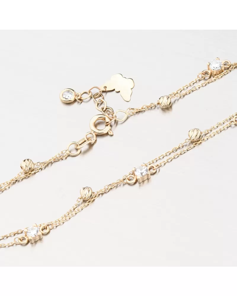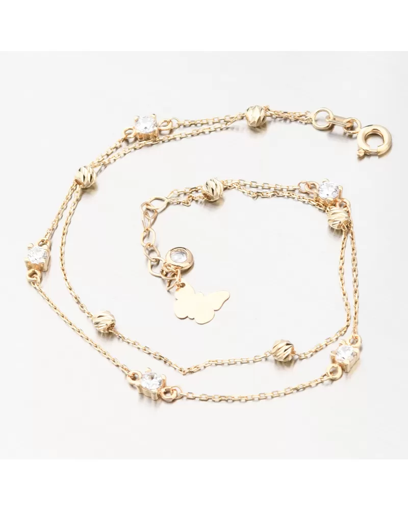 Krásny zlatý náramok pozostávajúci z dvoch retiazok. Vďaka tomu vyzerá náramok na zápästí oveľa výraznejšie. Jedna retiazka typu kotva je zdobená zlatými guličkami. Gule sú zdobené fazetami, ktoré sú vyrobené diamantovým nástrojom, ktorý výsledným fazetám dodáva maximálny lesk, vďaka čomu dokonale odrážajú svetlo a majú krásnu brilanciu zo všetkých uhlov. Druhá retiazka, tiež kotvičkového typu, je zdobená trblietavými zirkónmi. Na konci predlžovacej retiazky nájdete roztomilého motýľa.