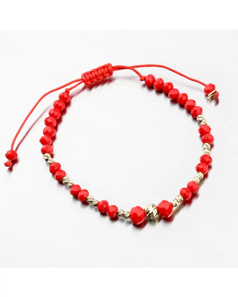 Veľmi obľúbený typ špagátového náramku, ktorý má výhodu vo svojej univerzálnej veľkosti a obľúbenej červeno-zlatej kombinácii farieb. . Zlaté guličky sú zdobené facetami, ktoré sú zhotovené diamantovým nástrojom, ktorý dodáva vzniknutým facetám maximálny lesk, vďaka ktorému dokonale odráža svetlo a majú krásnu brilanciu zo všetkých uhlov pohľadu! V strede náramku je jedna veľká zlatá gulička a potom dve väčšie červené. zlaté.
