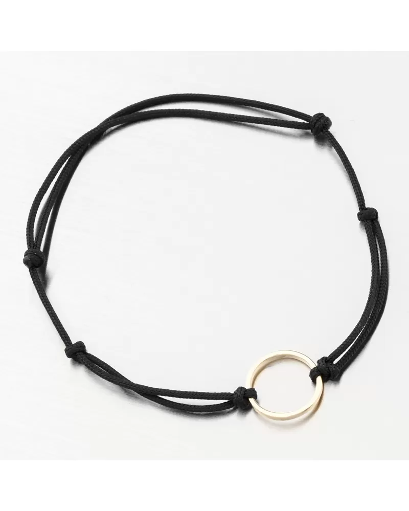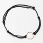 Veľmi obľúbený typ povrázkového náramku, ktorý má výhodu vo svojej univerzálnej veľkosti a obľúbenej čierno-zlatej kombinácii farieb. Náramok je tvorený z čierneho dvojitého povrázku, ktorý je ozdobený príveskom v samotnom strede zo žltého zlata v tvare kruhu.