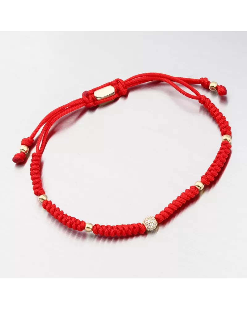 Veľmi populárny typ náramku struny, ktorý má výhodu vo svojej univerzálnej veľkosti a populárnej červeno-žltej kombinácii farieb. Náramok sa skladá z červenej dvojitej šnúry, ktorá je zdobená zlatými malými guľkami vo vysokom lesku a príveskom v strede žltého zlata v tvare gule. Všetky sú vybavené brilantnými mletými zirkónmi, ktoré poskytujú maximálnu brilanciu leštenej aspektu, dokonale odráža svetlo a neuveriteľne svieti zo všetkých pohľadov.