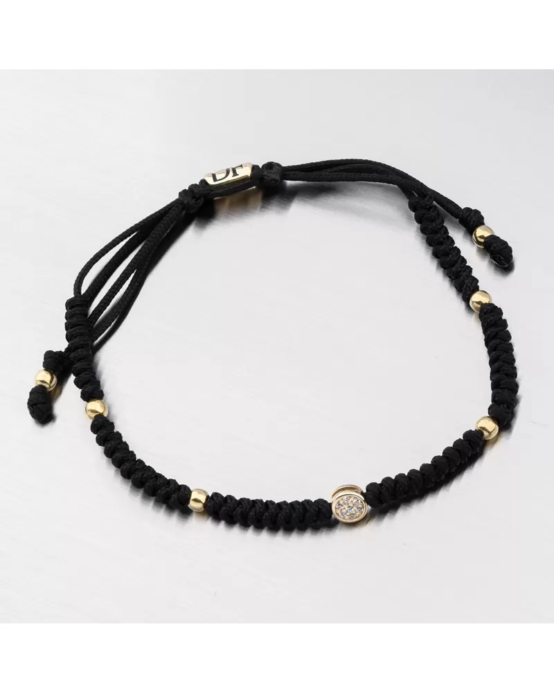Veľmi populárny typ náramku struny, ktorý má výhodu vo svojej univerzálnej veľkosti a populárnej čiernej žltej kombinácii farieb. Náramok pozostáva z čiernej dvojitého šnúr, ktorý je zdobený zlatými malými guľkami vo vysokom lesku a príveskom v strede žltého zlata v tvare gule. Na jednej strane je vybavený brilantnými zirkónmi brúsky, ktoré poskytujú maximálnu brilanciu leštenej aspektu, dokonale odráža svetlo a neuveriteľne svieti zo všetkých pohľadov.