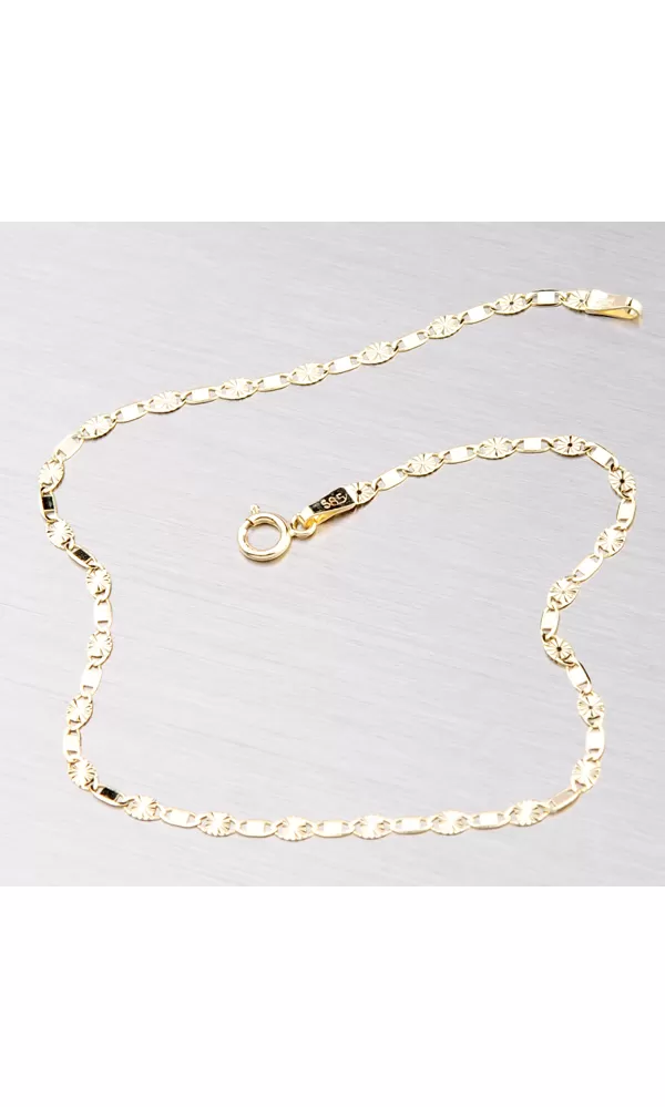 Slušivý náramok s gravírovanými plôškami je vyrobený zo žltého štrnásťkarátového zlata 585/000 v lesklej povrchovej úprave. Náramok má zapínanie na perový krúžok. Povrch je leštený do vysokého lesku. Navyše je náramok zdobený gravírovaním pomocou diamantového hrotu, ktorý dodáva šperku naximálny lesk a brilanciu.