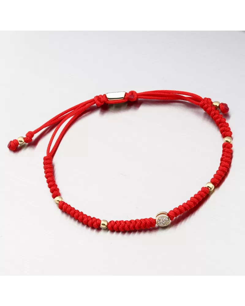 Veľmi populárny typ náramku struny, ktorý má výhodu vo svojej univerzálnej veľkosti a populárnej červeno-žltej kombinácii farieb. Náramok sa skladá z červenej dvojitej šnúry, ktorá je zdobená zlatými malými guľkami vo vysokom lesku a príveskom v strede žltého zlata v tvare gule. Na jednej strane je vybavený brilantnými zirkónmi brúsky, ktoré poskytujú maximálnu brilanciu leštenej aspektu, dokonale odráža svetlo a neuveriteľne svieti zo všetkých pohľadov.