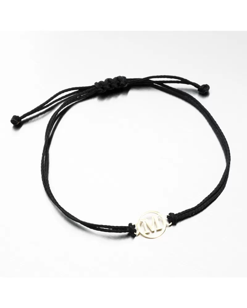 Veľmi obľúbený typ povrázkového náramku, ktorý má výhodu vo svojej univerzálnej veľkosti, obľúbenej čierno-zlatej kombinácii farieb a tiež vhodnosti pre obe pohlavia. Náramok je tvorený z čierneho dvojitého povrázku, ktorý je ozdobený vo svojom strede písmenom M zo žltého zlata. Ak ste nenašli v našej ponuke písmeno, ktoré potrebujete, na zákazku môžeme vyrobiť akékoľvek písmeno abecedy a to do 14 dní.
