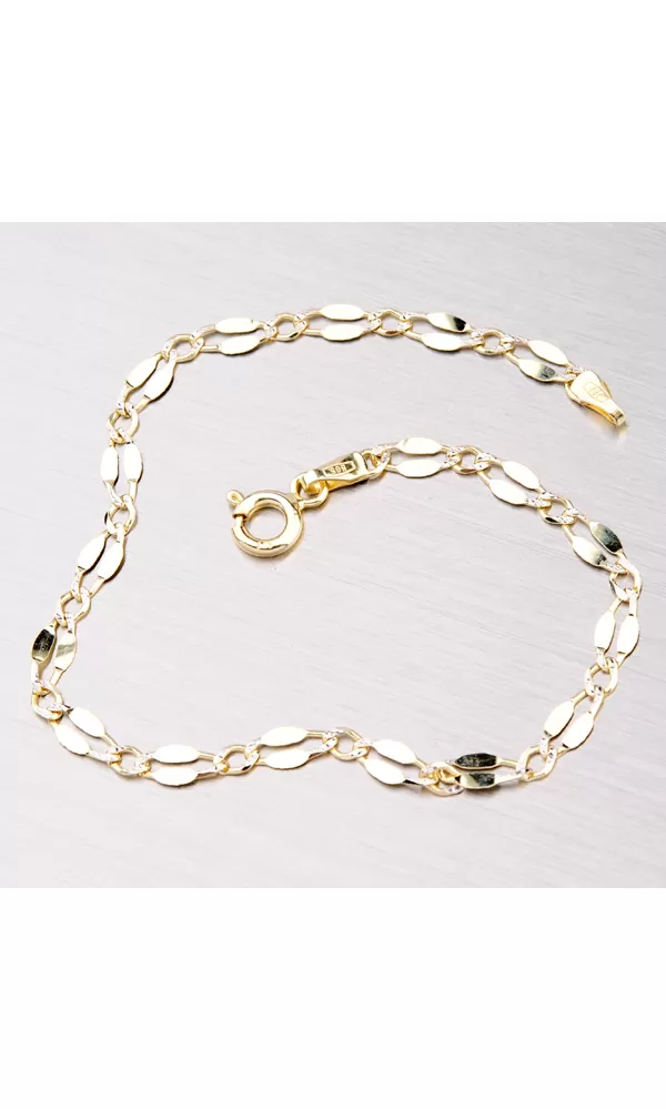 Tento náramok je vyrobený v kombinácii bieleho a žltého štrnásťtikarátového zlata 585/000 v lesklej povrchovej úprave. Povrch je leštený do vysokého lesku. Navyše je náramok zdobený gravírovaním pomocou diamantového hrotu, ktorý dodáva šperku naximálny lesk a brilanciu. Náramok má zapínanie na perový krúžok.