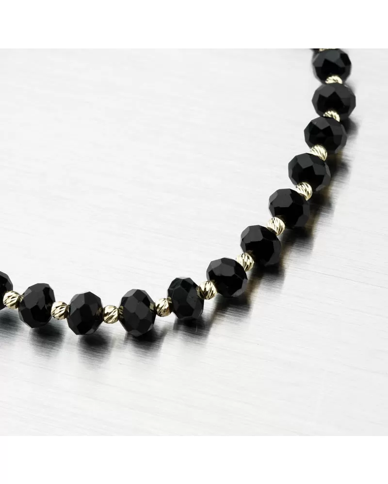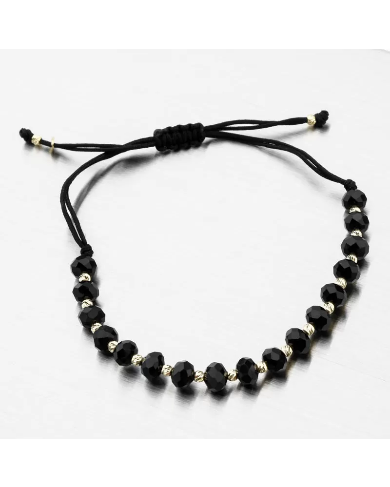 Velmi oblíbený typ provázkového náramku, který má výhodu ve své univerzální velikosti, oblíbené černo-zlaté kombinaci barev a také vhodnosti pro obě pohlaví. Náramek je tvořen z černého provázku, který je ozdoben výraznými černými broušenými kuličkami v kombinaci s drobnými kuličkami ze žlutého zlata, které jsou také broušené. Zlaté kuličky jsou zdobeny facetami, které jsou zhotoveny diamantovým nástrojem, který dodává vzniklým facetám maximální lesk, díky kterému dokonale odráží světlo a mají krásnou brilanci ze všech úhlů pohledu! Náramek přímo zaří a při každém pohybu se nádherně leskne.