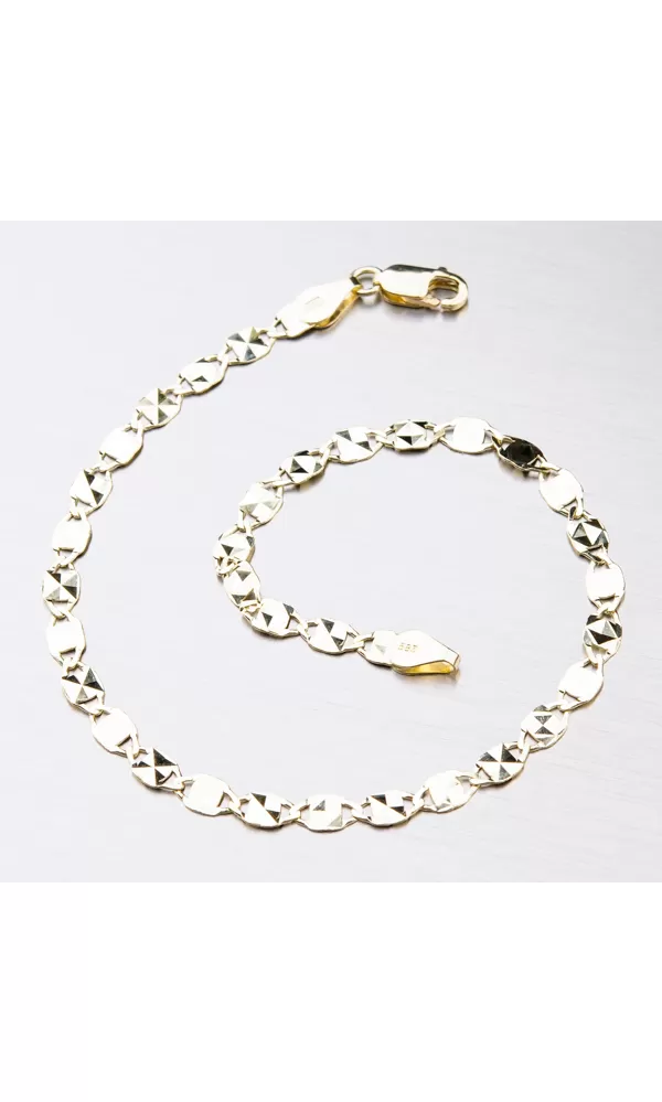 Tento náramok rozjasní vaše zápästie a bude priťahovať pozornosť. Náramok je tvorený z plošiek, ktoré sú zdobené gravírovaním. Gravírovanie je prevedené diamantovým rycím hrotom, ktorý zaisťuje najvyšší možný lesk gravírovaných facet. Náramok je vyrobený zo štrnásťkarátového zlata 585/000 v lesklej povrchovej úprave.  Náramok má zapínanie na perový krúžok.