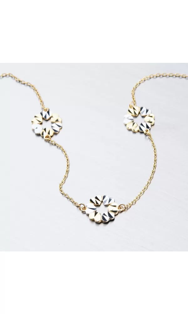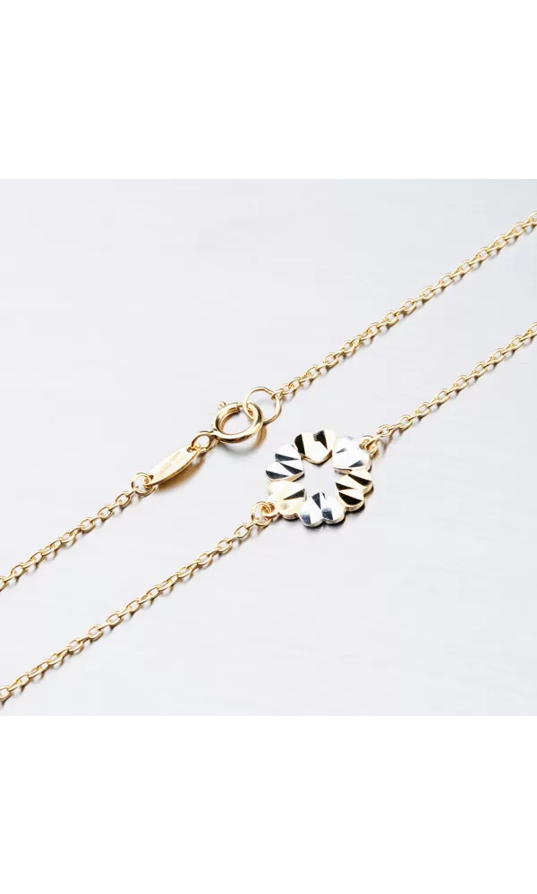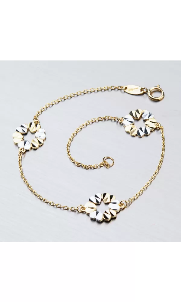 Zlatý náramok vás uchváti príveskami v tvare kvetov, ktoré sú tvorené srdiečkami zdobené bielou farbou zlata. Náramok tvorí konštrukcia v tvare retiazky anker, ktorý je pevný a spoľahlivý. Prívesky sú ako bonus, ktorý tvorí z náramku výnimočný šperk.