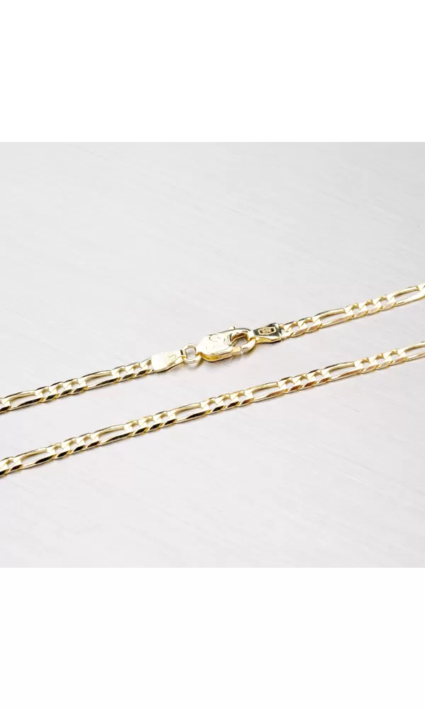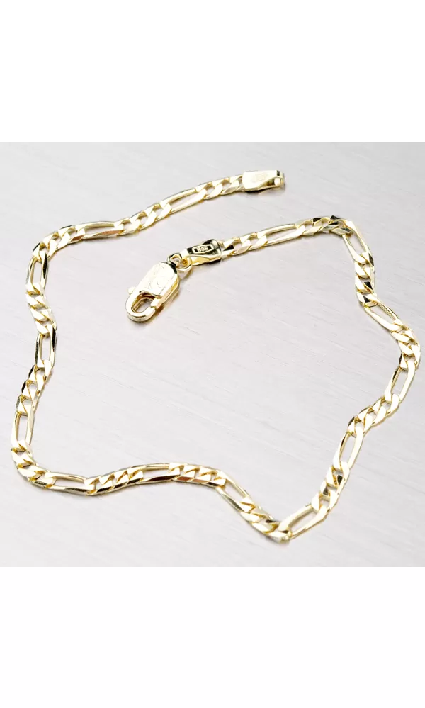 Silnejší náramok Figaro rozhodne nikto neprehliadne. Jednoduchý dizajn zaujme ženy aj mužov. Náramok sa príjemne nosí a je pevný. Náramok Figaro 3+1 je vyrobený zo žltého štrnástich karátového zlata 585/000 v lesklej povrchovej úprave so zapínaním na karabínku. Urobte si radosť a ozdobte svoje zápästie týmto náramkom. Lesklé prevedenie podporuje zlaté odlesky a luxusný vzhľad náramku.