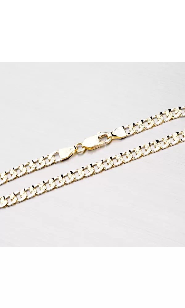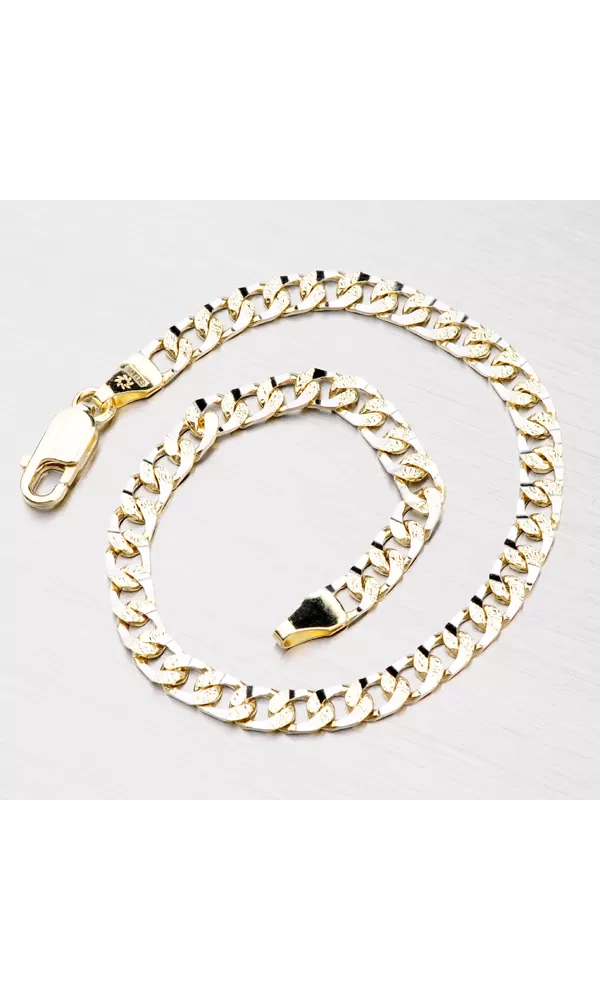 Zlatý náramok so zapínaním na karabínu zaujme na prvý pohľad svojím spracovaním. Tento náramok je vhodný svojim dizajnom ako pre ženy, tak aj pre mužov. Náramok je vyrobený zo štrnásťkarátového zlata 585/1000 v kombinácii žltej a bielej farby zlata. Je tvorený oválnymi očkami, ktoré sú jemne valcované. Časť plošiek v bielej farbe zlata sú zdobené pomocou diamantového nástroja, ktorý dodáva šperku mimoriadny lesk. Prepletené časti očiek sú bohato gravírované. Dĺžku náramku si vyberte podľa dostupných rozmerov. Ide o precízne spracovanie!