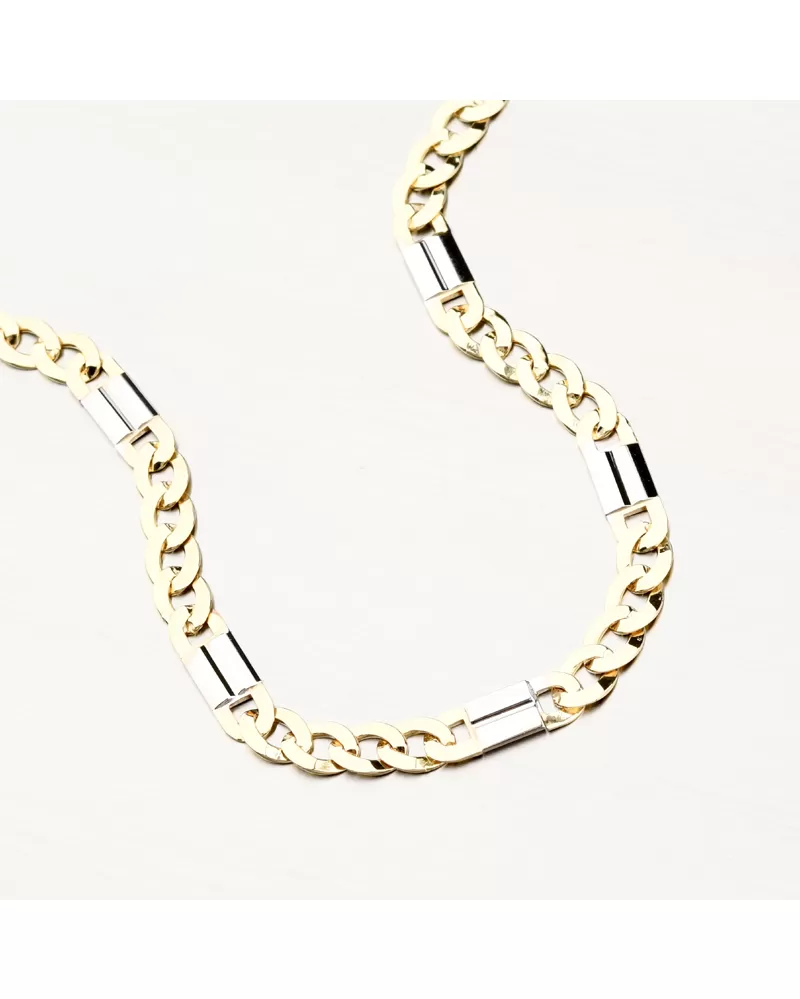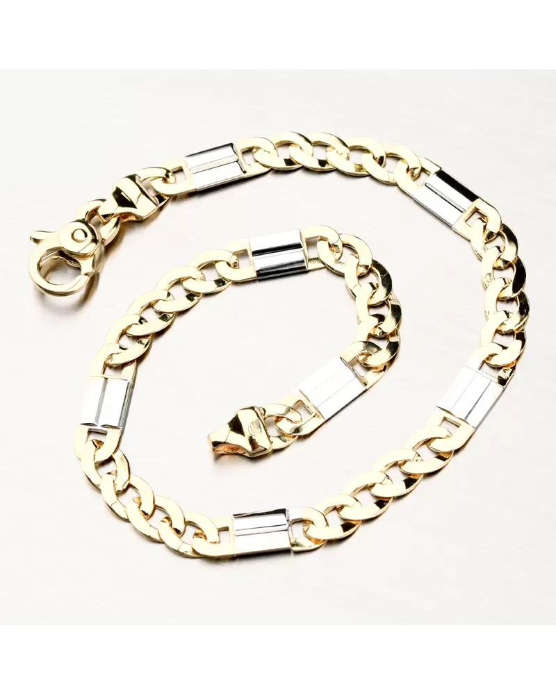 Výrazný zlatý náramok, ktorý len tak neprehliadnete. Náramok má odlišné spracovanie ako väčšina náramkov. Tvoria ho prepletené masívne očká a potom jeden väčší dielik, kde je prostredná časť v bielej farbe zlata. Očká sú už potom opäť v žltej farbe, ktorá celkovo prevláda. Pri tomto náramku sa nemusíte báť, že sa len tak pretrhne. Náramok je pevný a na ruke vyzerá luxusne.