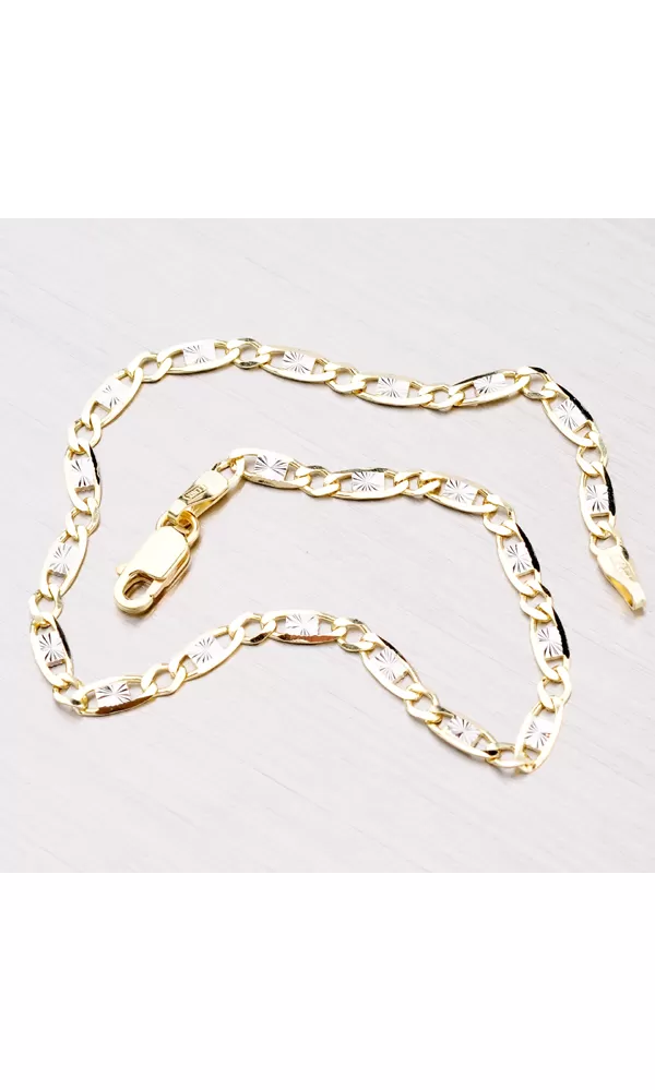 Neprehliadnuteľný náramok zaujme dvojfarebným prevedením a leskom, ktorý tvorí prepracované gravírovanie. Náramok je vyrobený zo žltého štrnásťkarátového zlata 585/000 v lesklej povrchovej úprave s gravírovaním bielej časti so zapínaním na karabínku. Gravírovanie je vykonávané pomocou diamantového hrotu, ktorý zaisťuje maximálny lesk gravírovaných facet.