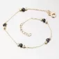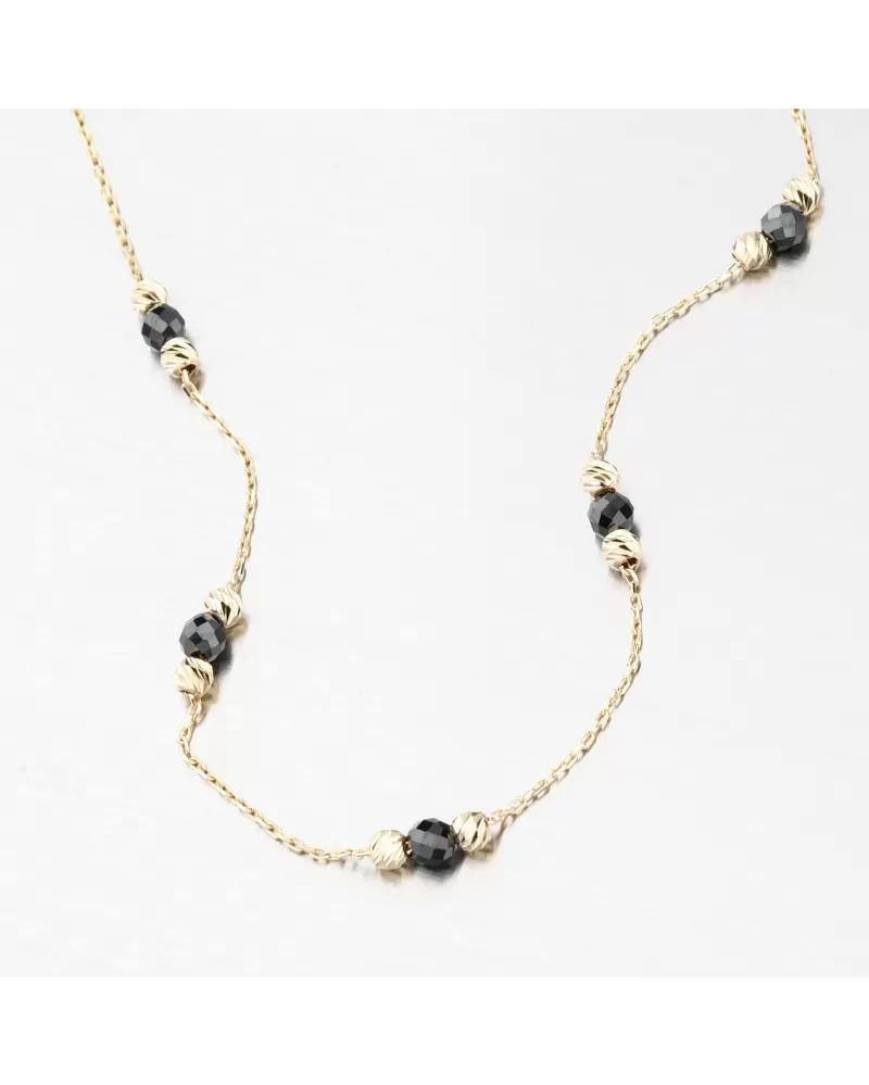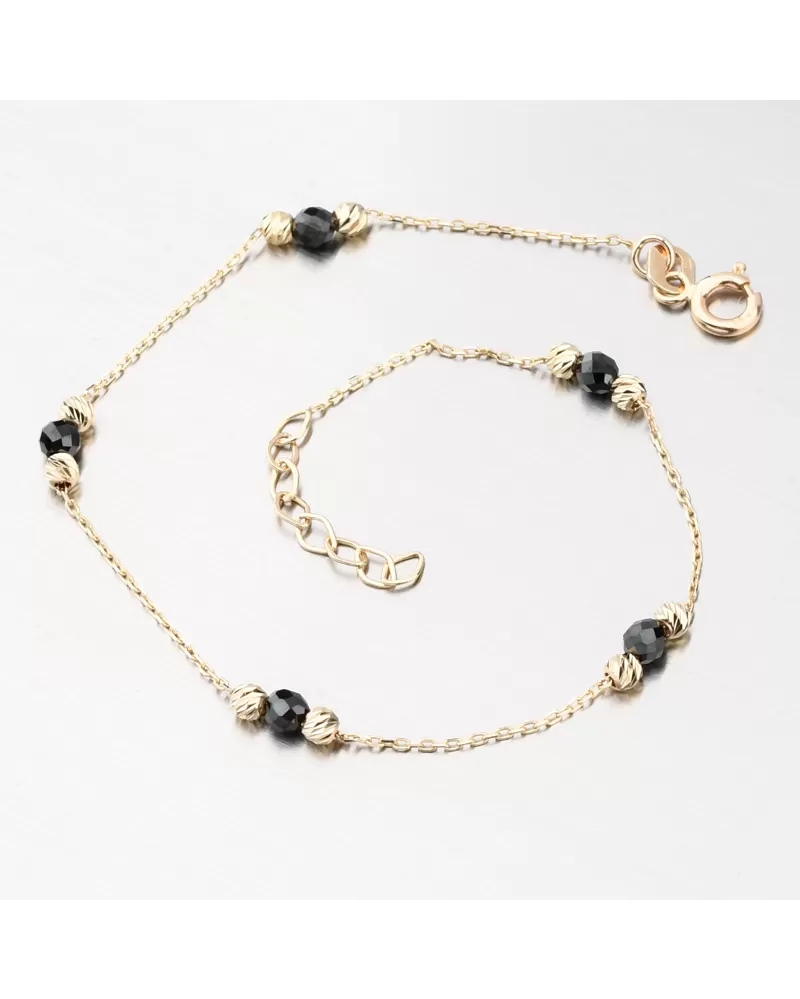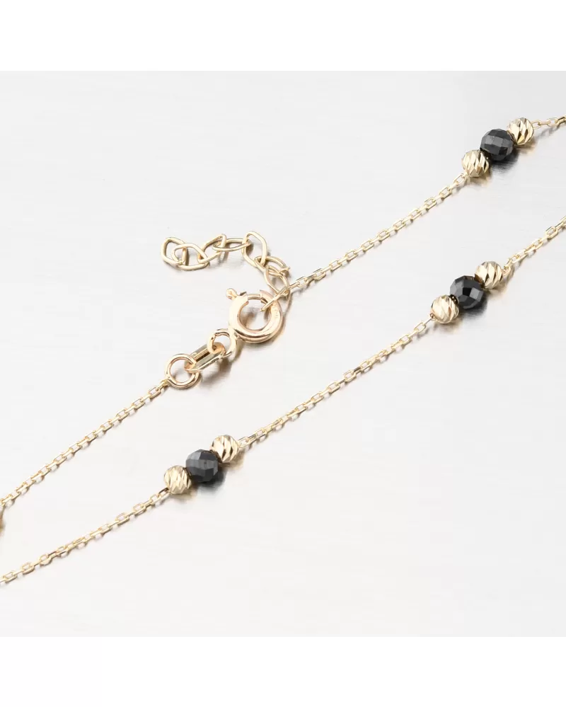Jemný, ale napriek tomu žiarivý zlatý náramok, ktorý nesmie chýbať vo vašej šperkovnici. Náramok zdobia lesklé zlaté guličky a medzi nimi je čierny brúsený zirkón. Guličky sú zdobené facetami, ktoré sú zhotovené diamantovým nástrojom, ktorý dodáva vzniknutým facetám maximálny lesk, vďaka ktorému dokonale odráža svetlo a majú krásnu brilanciu zo všetkých uhlov pohľadu.