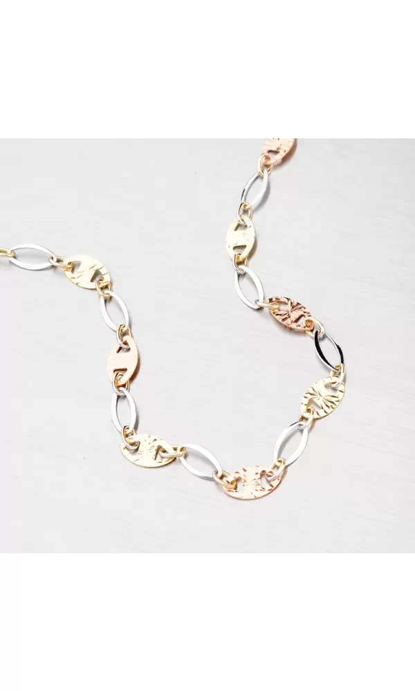 Nechajte sa rozmaznávať luxusnými šperkami. Náramok je vyrobený v kombinácii bieleho, žltého a ružového štrnásťkarátového zlata 585/1000. Je tvorený z dielikov z plôšok v lesklej povrchovej úprave s prierezmi a z plôšok, ktoré sú zdobené gravírovaním. Dĺžku náramku si vyberte podľa dostupných rozmerov. Ide o precízne spracovanie!