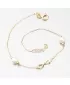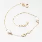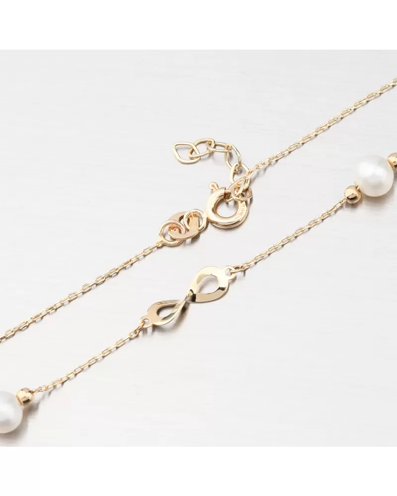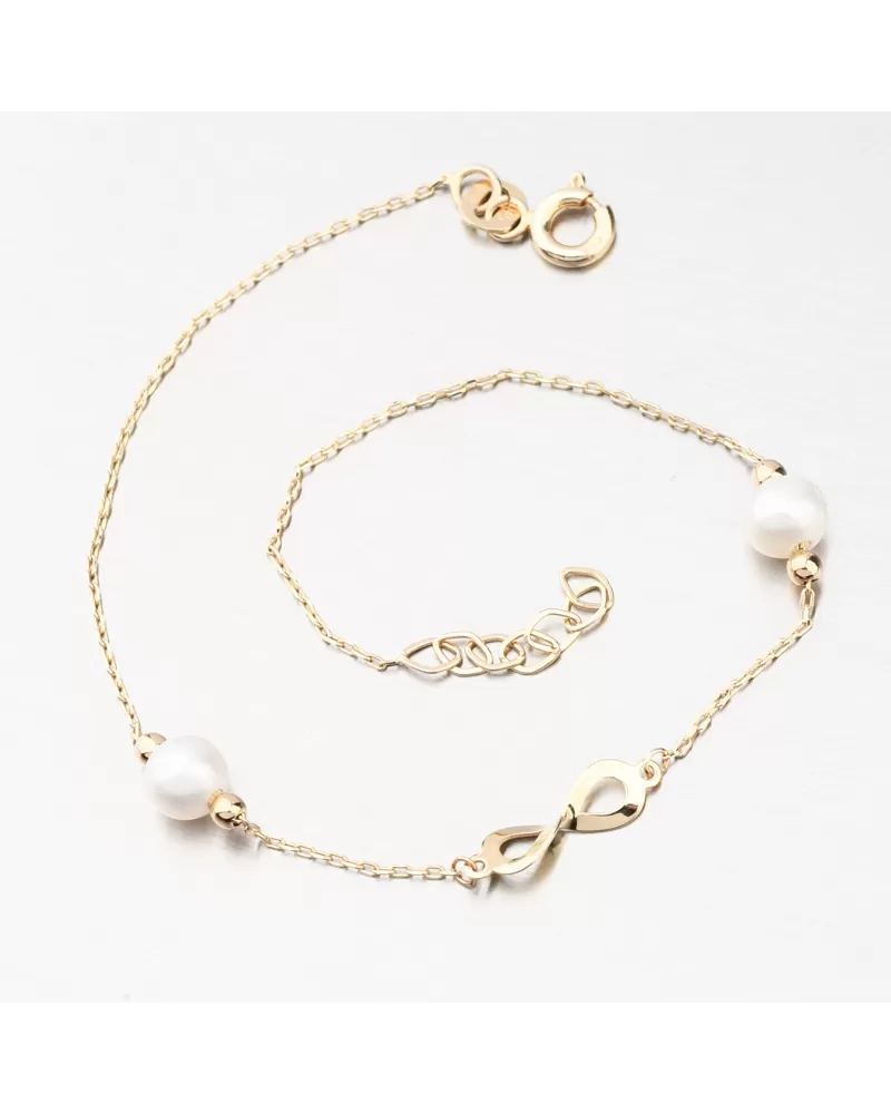 Jemný zlatý náramok typu anker, ktorý je ozdobený bielymi umelými perlami, ktoré sú vrcholom elegancie. V samotnom strede náramku je potom lesklá ozdoba v tvare nekonečna.