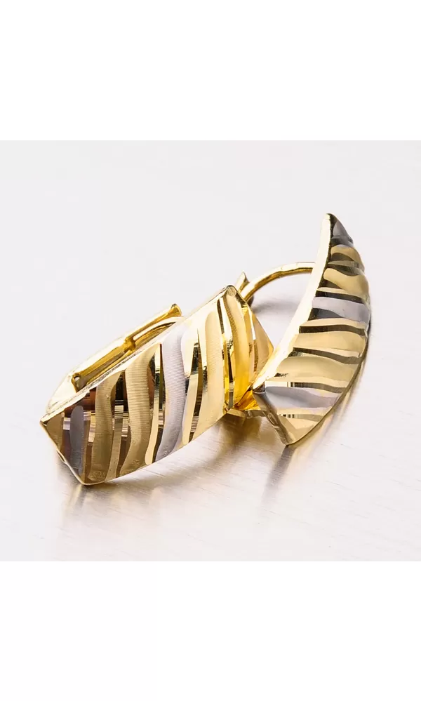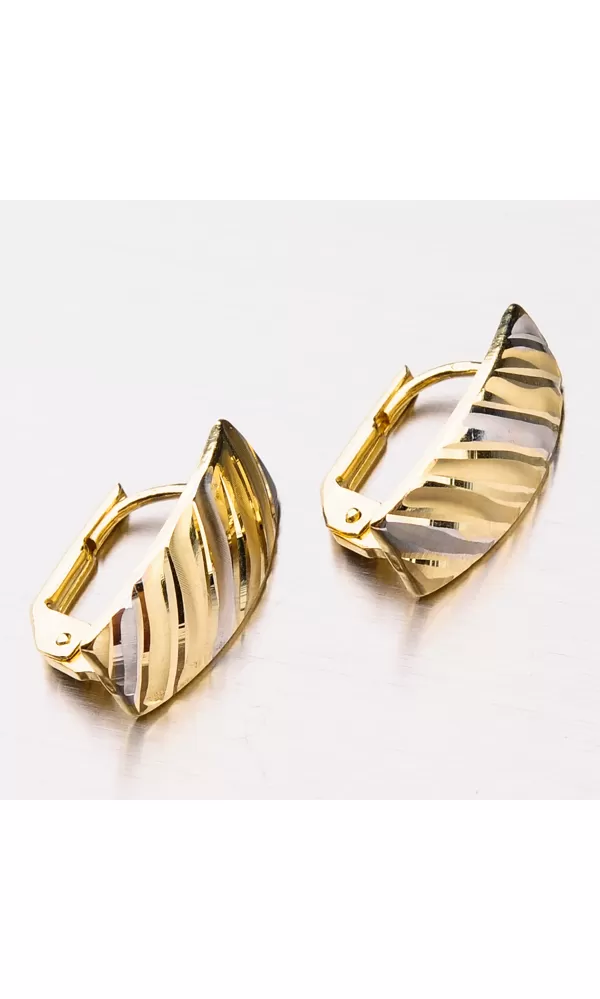 Veľmi obľúbený model náušníc je vyrobený zo štrnástich karátového zlata s rýdzosťou 585/1000 v kombinácii žltej a bielej farby zlata. pomocou diamantového hrotu a dodávajú šperku maximálny lesk a brilanciu zo všetkých uhlov. Výhodou tohto modelu je umiestnenie zapínania, ktoré je nižšie a náušnice tak skvele schová vstup a tým aj dierku v uchu.