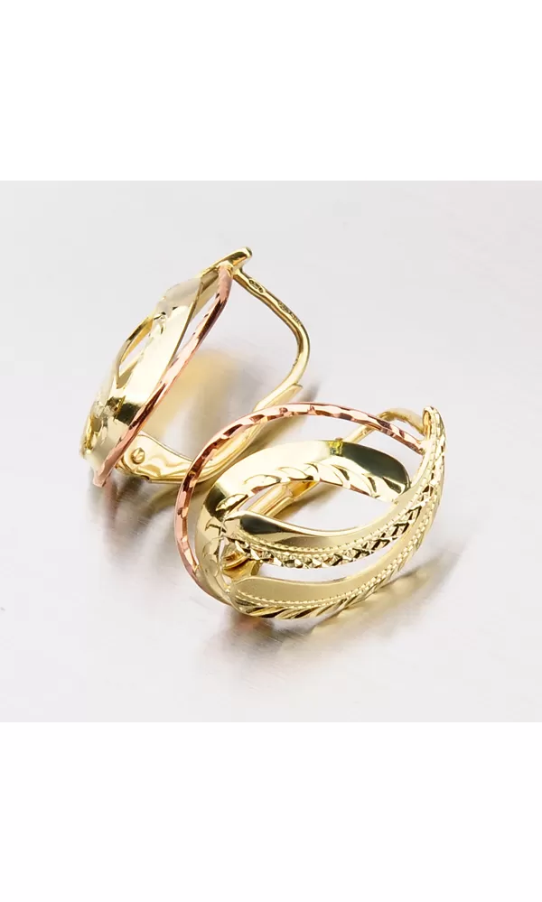 Klasické dámske náušnice sú vyrobené tradičnou klenotníckou technikou v kombinácii žltého a červeného štrnásťtikarátového zlata 585/1000 v lesklej povrchovej úprave a sú bohato zdobené ručným rytím. Náušnice sa zapínajú na klapky.