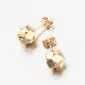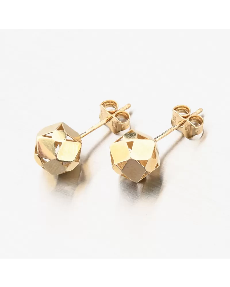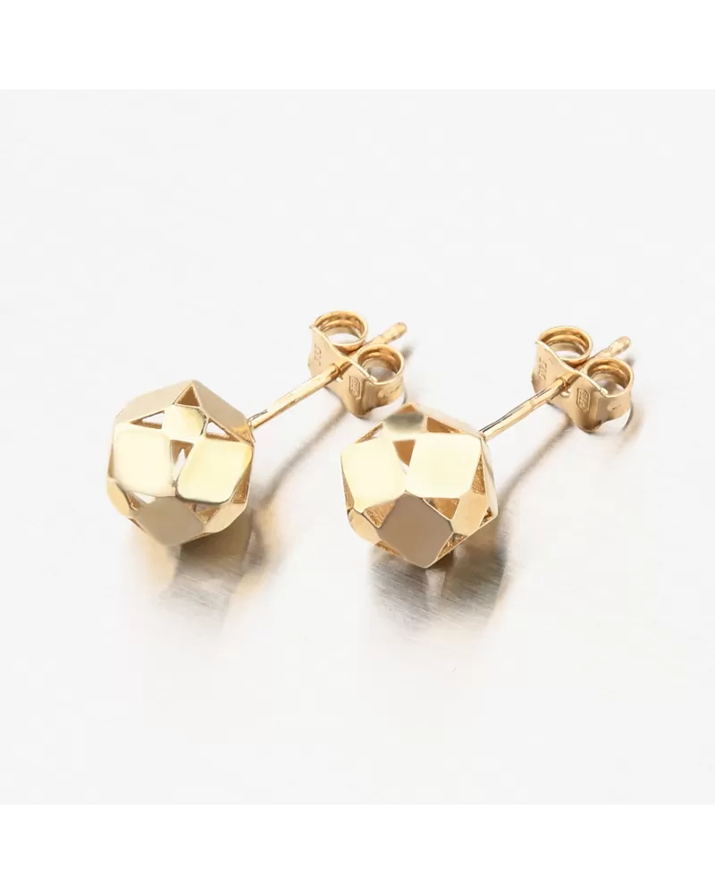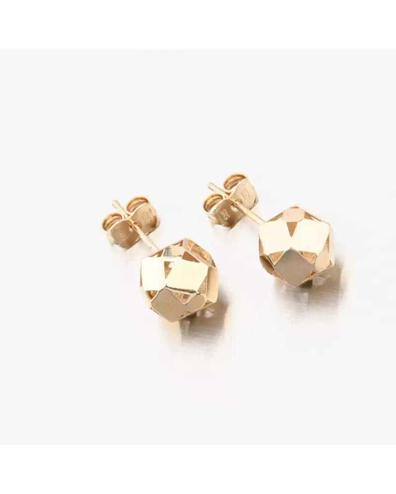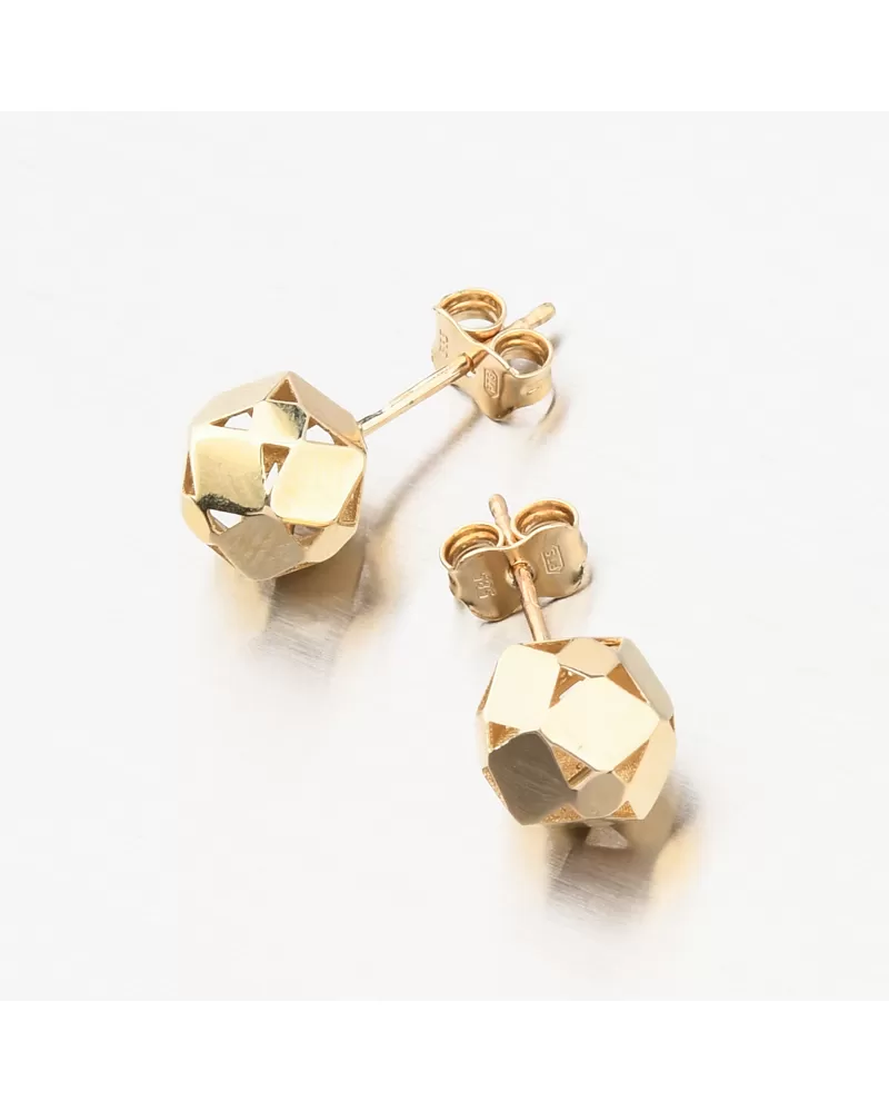 Originálny dizajn dámskych náušníc zo žltého zlata je tvorený z leštených doštičiek ktoré sú k sebe starostlivo letované. Ako celok tvorí tvar guličky, ktorá vďaka leštených plôch dokonale odráža svetlo. Náušnice sú opatrené zapínaním na puzetu, ktoré milujú ženy, ktoré nerady v náušniciach spia a tiež ktoré rady náušnice často menia.
