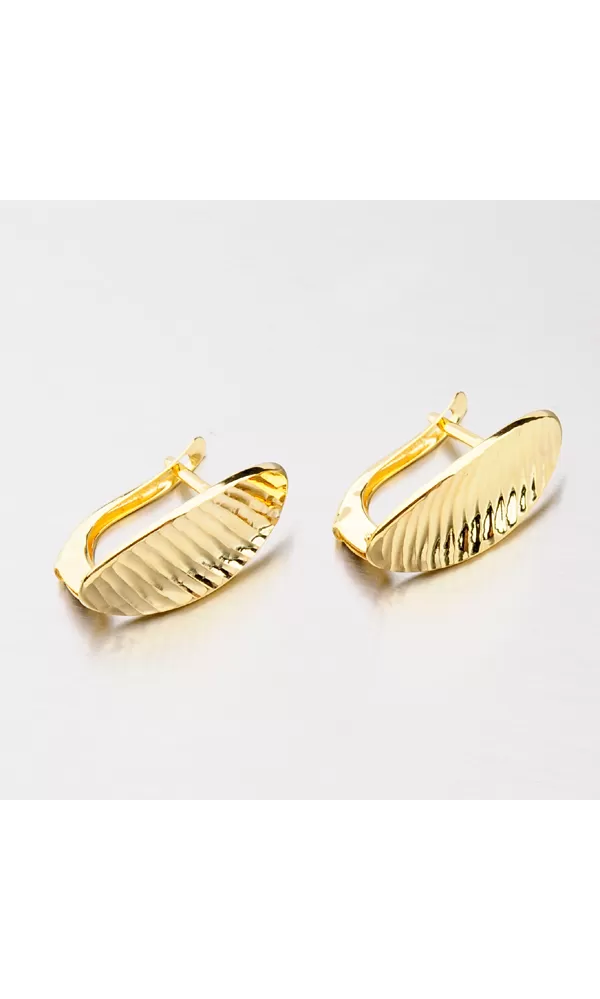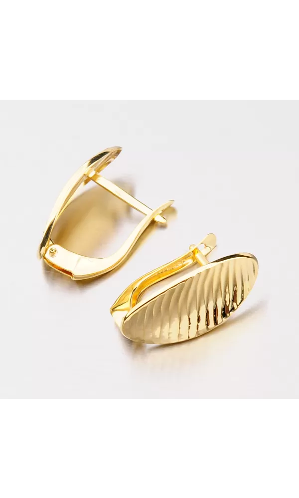 Krásne náušnice v oválnom tvare vyrobené zo žltého štrnástich karátového zlata s rýdzosťou 585/1000 v lesklej povrchovej úprave. Náušnice majú oválnu doštičku nadrobno prehnutú a hlavne zdobenú facetovanými lesklými prúžkami. Facety sú lesklé plôšky robené pomocou diamantového hrotu. Facety dodávajú šperku maximálny lesk a brilanciu zo všetkých uhlov. Náušnice sa zapínajú na bezpečnú klapku, vďaka ktorej nehrozí ich strata.