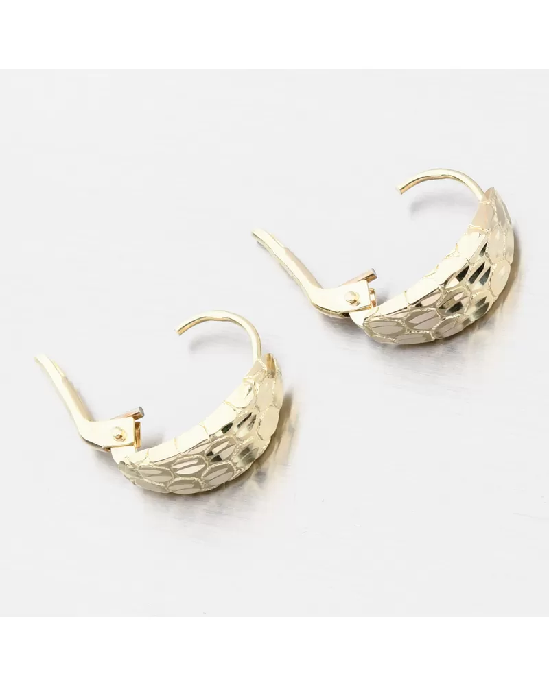 Náušnice sú vyrobené zo žltého štrnásťkarátového zlata 585/1000 v lesklej povrchovej úprave. Tento šperk bol skontrolovaný puncovým úradom, ktorý overil jeho kvalitu a označil štátnym puncom pre danú rýdzosť.