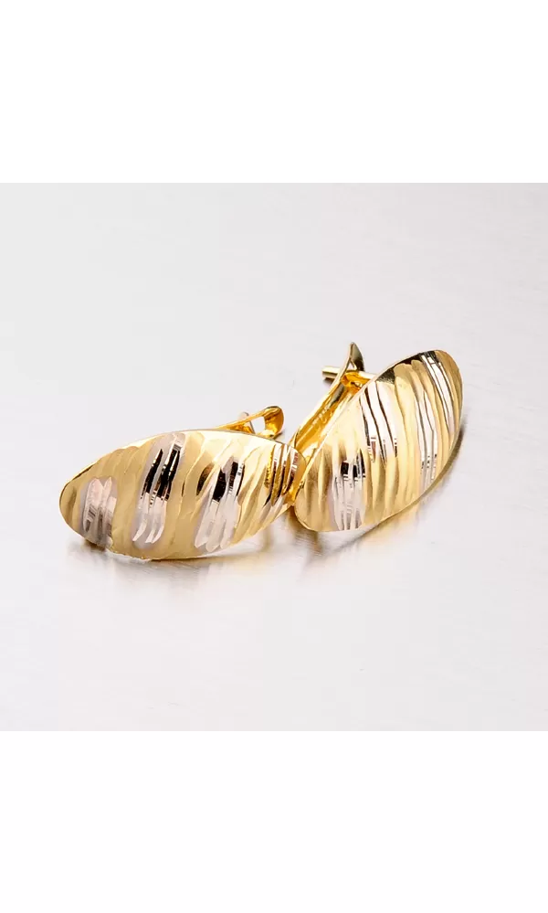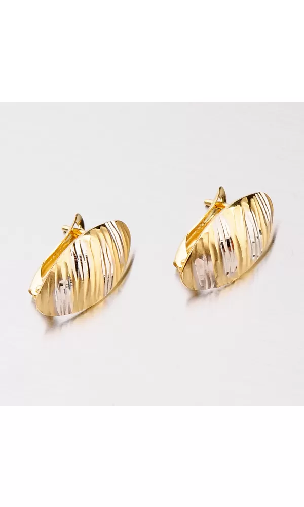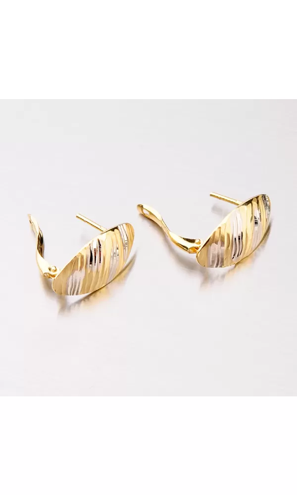 Zlaté náušnice vyrobené zo štrnástich karátového zlata o rýdzosti 585/1000 kombinácii bielej a žltej farby zlata. Náušnice majú celú prednú časť upravenú lesklými facetami. Facety sú lesklé plôšky robené pomocou nástroja s diamantovým hrotom, vďaka ktorému sú facety lesklé a odrážajú maximum svetla a dodávajú brilancii celému šperku. Náušnice sa zapínajú na bezpečnú klapku a budú pohodlným doplnkom po celú dobu nosenia.