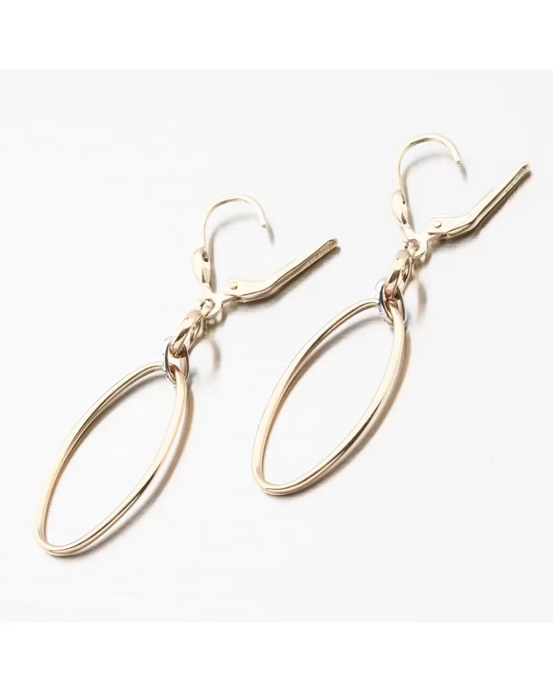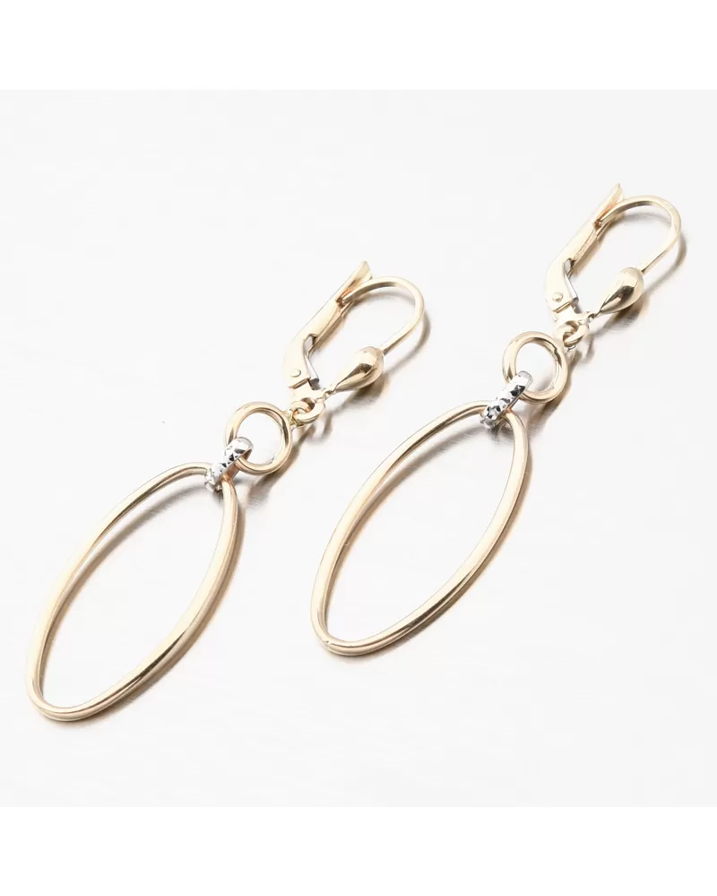 Nádherné zlaté visiace náušnice, ktoré žiaria svojou eleganciou a kvalitným spracovaním. Náušnice zdobia drobný zlatý krúžok, ktorý je pripevnený k výraznému oválnemu kruhu pomocou jemného dielika v bielej farbe zlata. Tento spoj je zdobený nádhernými facetami. Facety sú zhotovené diamantovým nástrojom, ktorý dodáva vzniknutým facetám maximálny lesk, vďaka ktorému dokonale odráža svetlo a majú krásnu brilanciu zo všetkých uhlov pohľadu! Vďaka svojej konštrukcii a nízkej váhe budú náušnice vhodné na každodenné nosenie.
