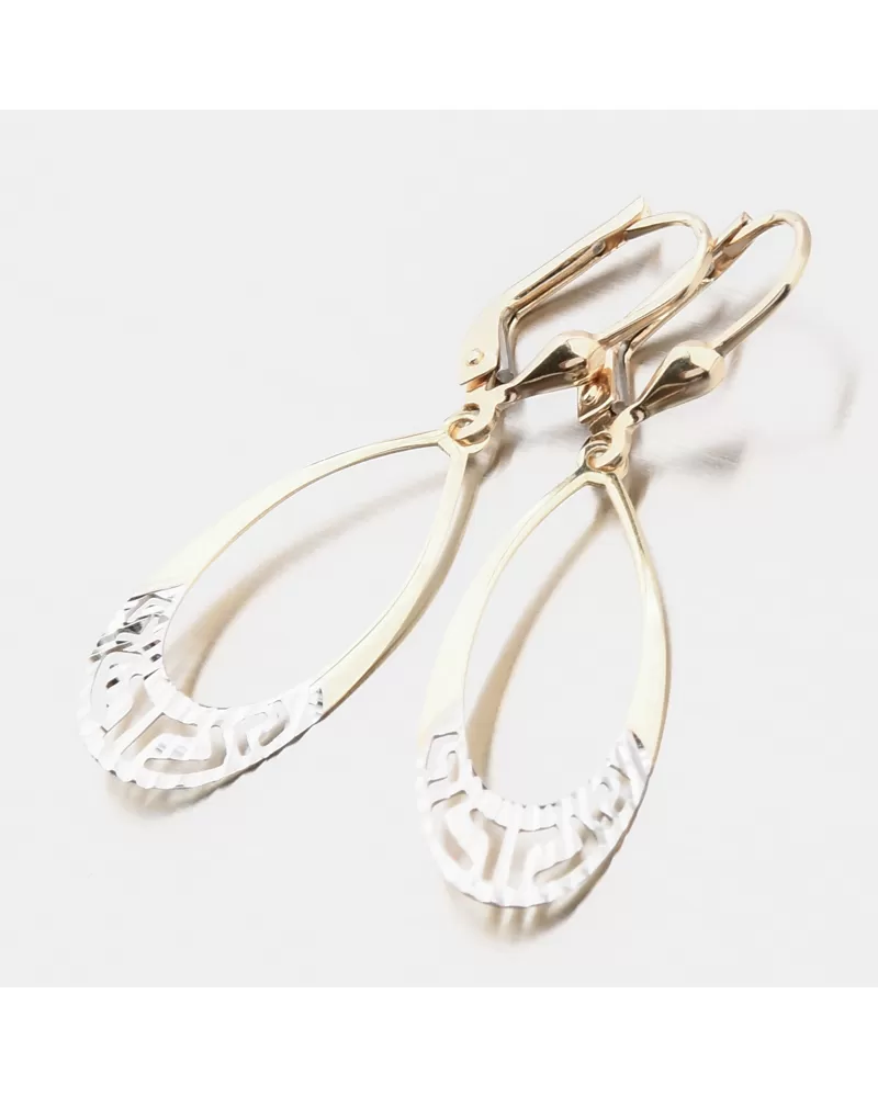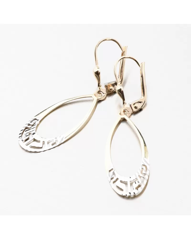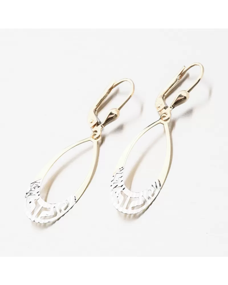 Elegantné visiace náušnice oválneho tvaru vás zaujmú svojim decentným spracovaním.Spodná časť náučníc je v bielej farbe zlata a je zdobená nádhernými facetami. Facety sú zhotovené diamantovým nástrojom, ktorý dodáva vzniknutým facetám maximálny lesk, vďaka ktorému dokonale odráža svetlo a majú krásnu brilanciu zo všetkých uhlov pohľadu! Vďaka svojej konštrukcii a nízkej váhe budú náušnice vhodné na každodenné nosenie.