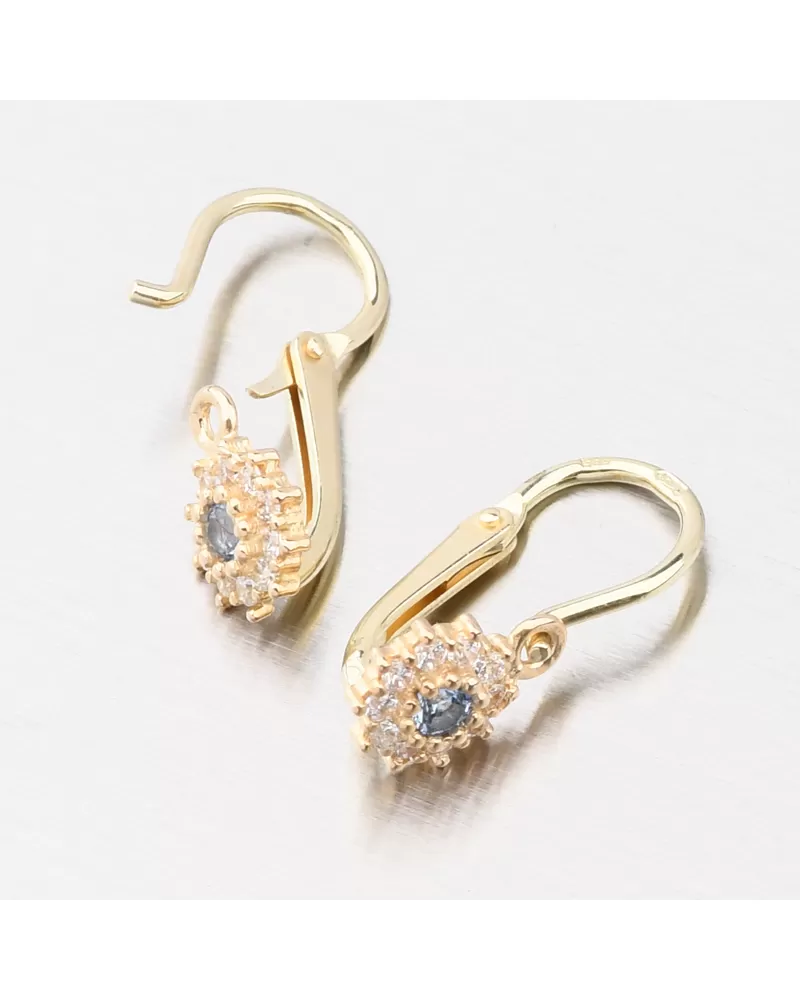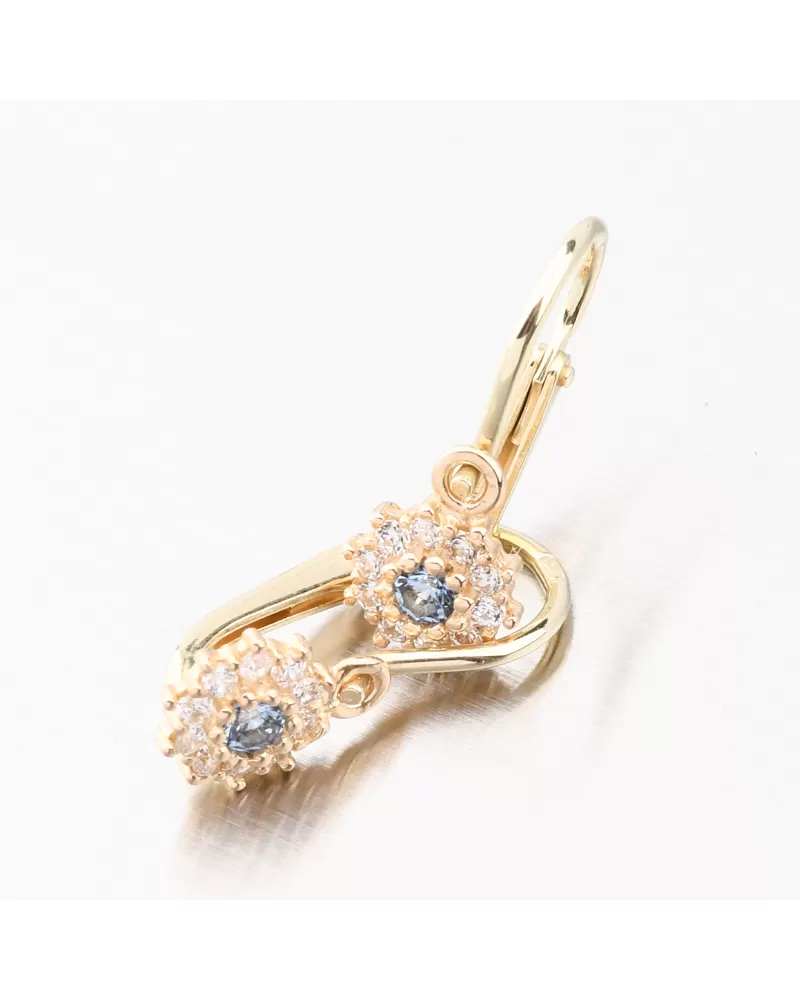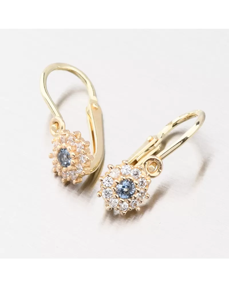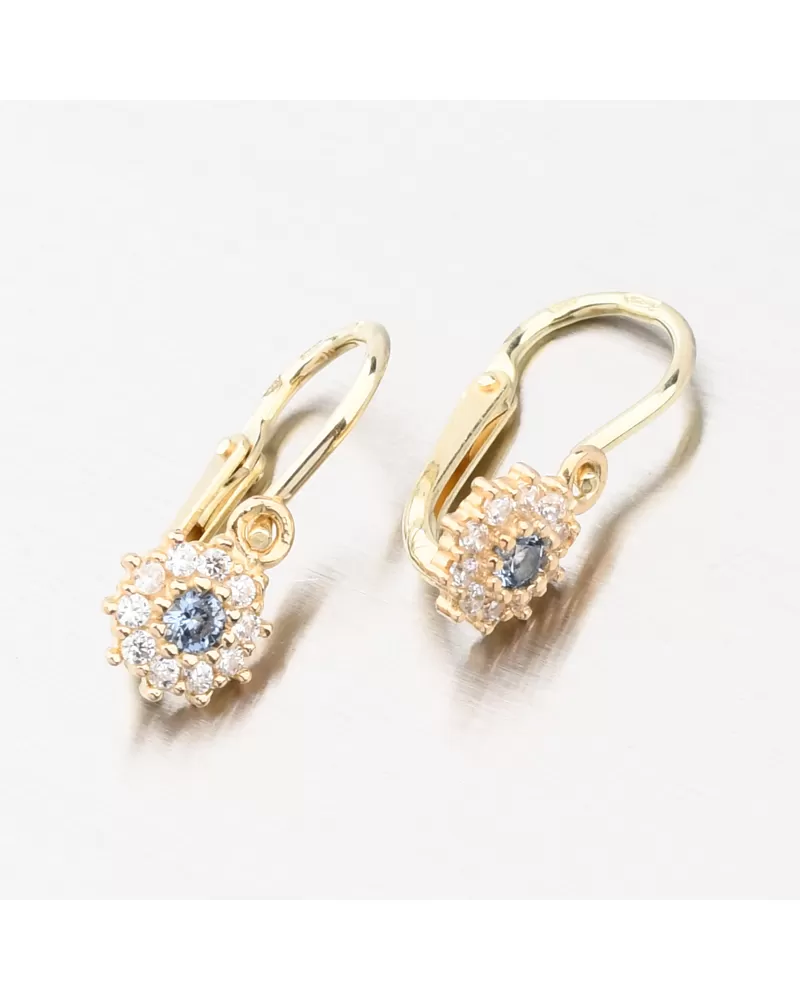 Náušnice budou pravděpodobně prvním šperkem vaší malé princezny. Proto si necháváme záležet na jejich provedení o to více. Tento model dětských náušnic je navržen tak, aby co nejméně překážel. Zaoblené hrany a pevné zapínání na přední straně slibují pohodlnost a bezpečí. Náušnice jsou zdobeny s modrým zirkonem kolem kterého jsou vsazeny menší zirkony v briliantovém brusu. Tento brus zajišťuje zirkonům dokonalý odraz světla a zirkony se nádherně třpytí.