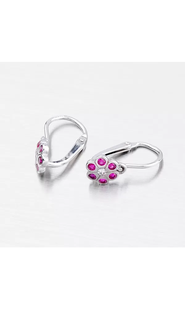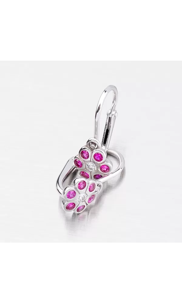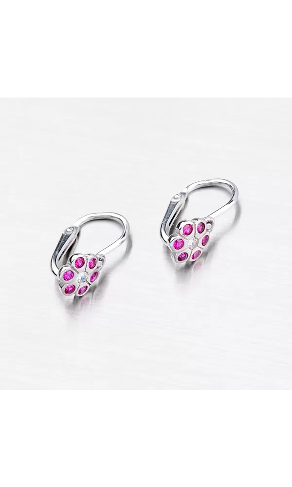 Detské náušnice v tvare kvietky so syntetickými červenými rubínmi sú vyrobené z bieleho štrnásťtikarátového zlata s rýdzosťou 585/1000 v lesklej povrchovej úprave. Náušničky sa zapínajú na detské brizúry a tak nehrozí ich pád a strata.