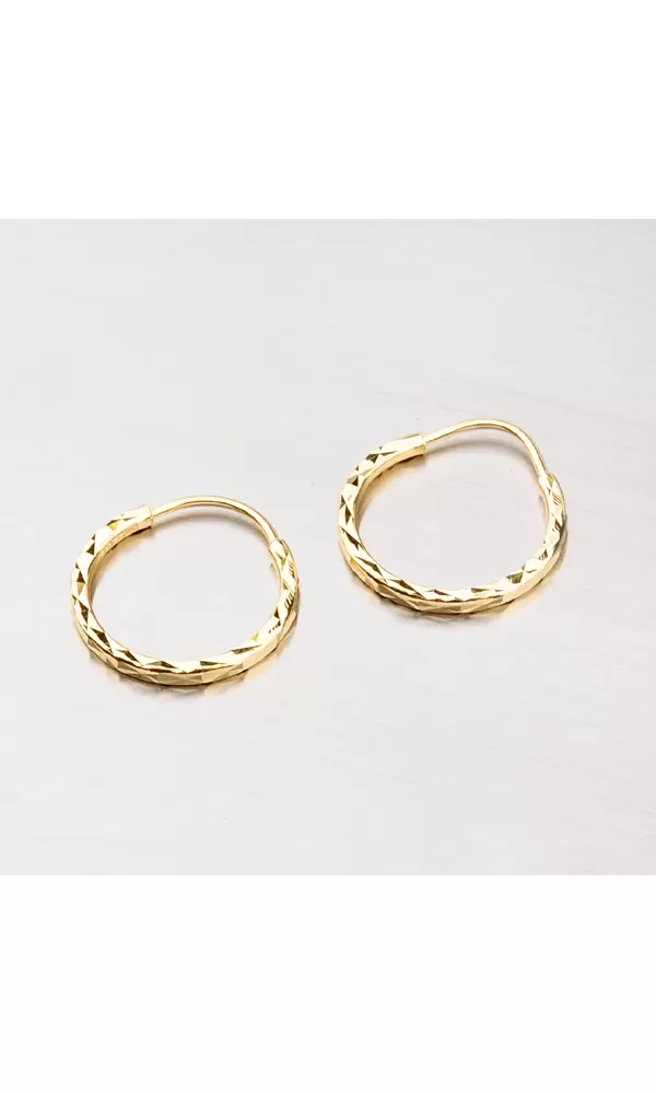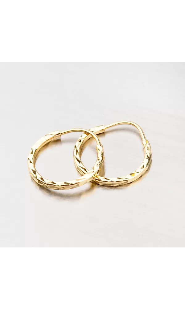 Elegantné dámske krúžky sú vyrobené zo žltého štrnásťkarátového zlata s rýdzosťou 585/1000. Náušnice sú zdobené diamantovým gravírovaním, pri ktorom diamantový hrot rýbacieho nástroja zaisťuje naozaj vysoký lesk a brilanciu zo všetkých uhlov. Tieto decentné náušnice oslovia najmä ich eleganciou a možnosťou nosiť ich k akémukoľvek outfitu.