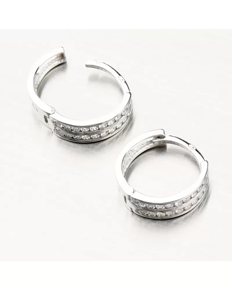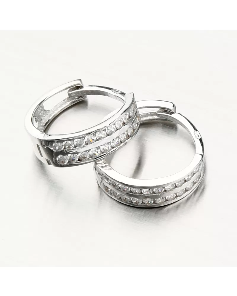 Jemné, ale výrazné náušnice zdobené dvoma radmi iskrivých zirkónov. Zirkóny sú briliantového brusu, zaisťuje maximálnu brilanciu vybrúsených facet, dokonale odráža svetlo a neuveriteľne žiari z každého uhla pohľadu. Kruhy patria k nestarnúcim doplnkom, ktoré musí mať každá žena vo svojej šperkovnici. Náušnice sú vďaka svojej konštrukcii vhodné na každodenné nosenie a spolu s fantastickým zapínaním, ktoré sa len jednoducho zaklapne a drží, budú ideálnym šperkom.