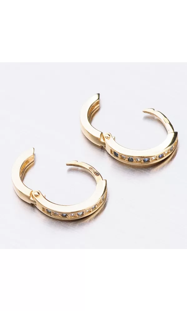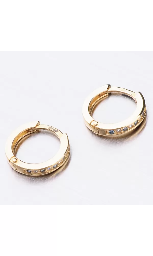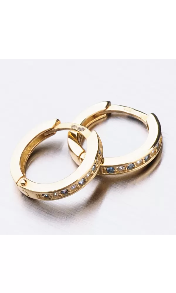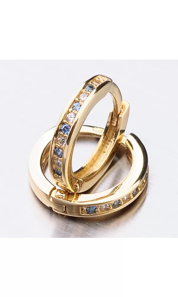 Něžné náušnice kroužky s pevnou konstrukcí si zamilujete vy i vaše malá parádnice. Kroužky jsou velice praktické a velmi pohodlné a to je přesně to co potřebujete. Tento model zdobí přední strana precizně osázená zirkony v briliantovém brusu. Zirkony se pravidelně střídají ve dvou barevných kombinací a to v bílé a modré barvě. Zadní strana je hladká a pokud vaší princeznu zirkony omrzí dají se kroužky nosit i zadní stranou dopředu.