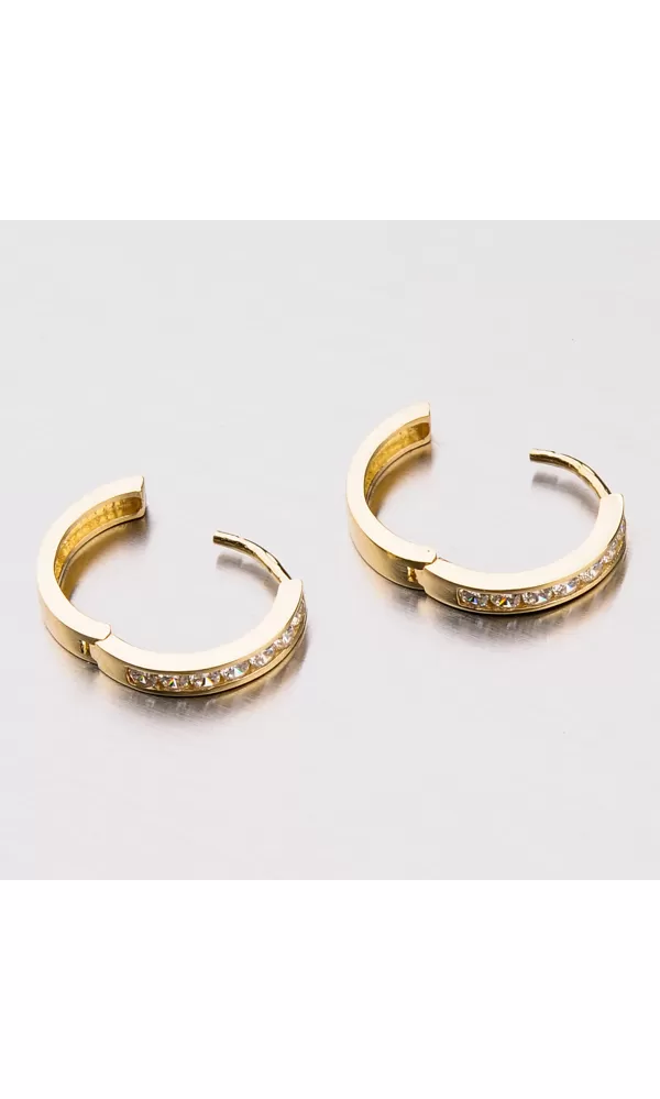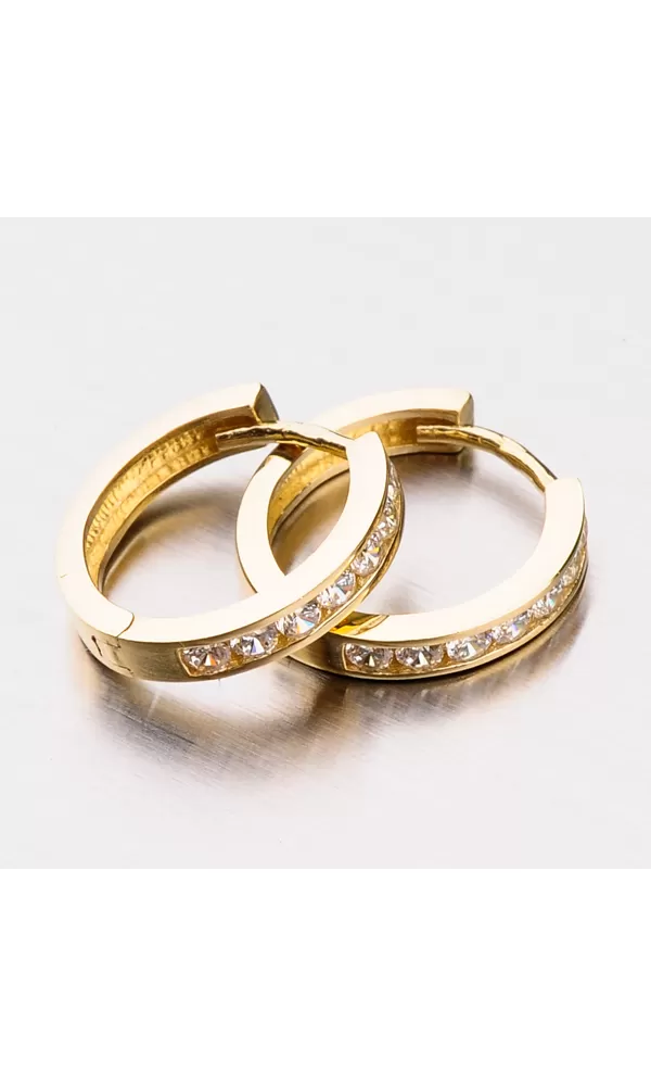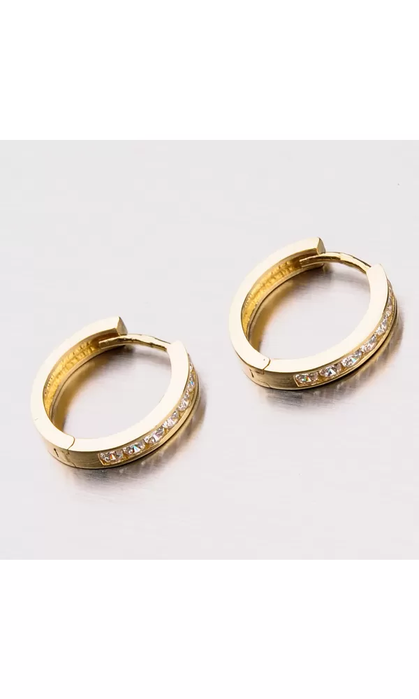 Krásne dámske náušnice vyrobené zo žltého zlata s čistotou 585/1000 v lesklom povrchu. Sú zdobené zirkónmi v brilantnom strihu, ktoré sú vpredu. Zadná časť náušníc je hladká a môžete ho používať a nosiť náušnice v naopak. Náušnice sú nielen krásne, ale aj praktické a veľmi pohodlné. Sú vhodné pre ženy a dievčatá.