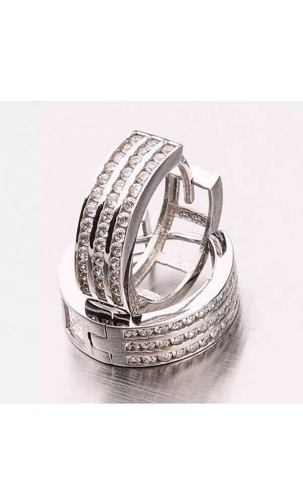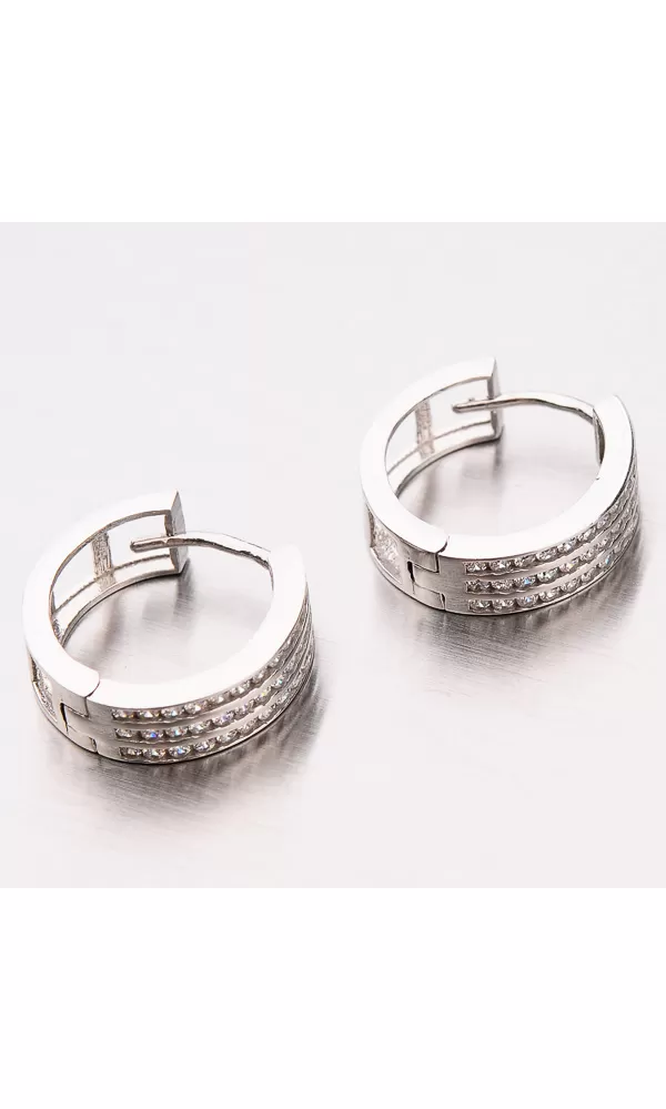 Milujete kruhy a hľadáte trochu niečo iné ako klasiku? Čo napríklad tieto silné kruhy, ktoré vynikajú množstvom zirkónov v briliantovom bruse. Zirkóny sú precízne vsadené jeden vedľa druhého a tvoria tri rady. Zadná strana náušnice tiež nie je na zahodenie. Má prierezy v tvare štvorca. Takže ak vás zirkóny omrzia stačí náušnicu otočiť.