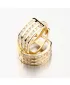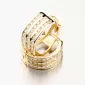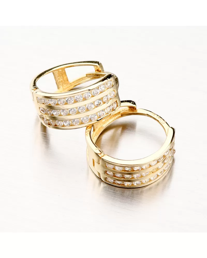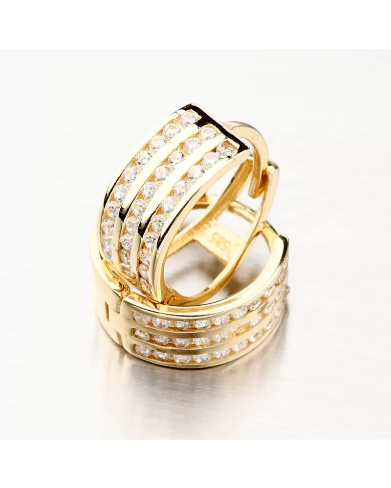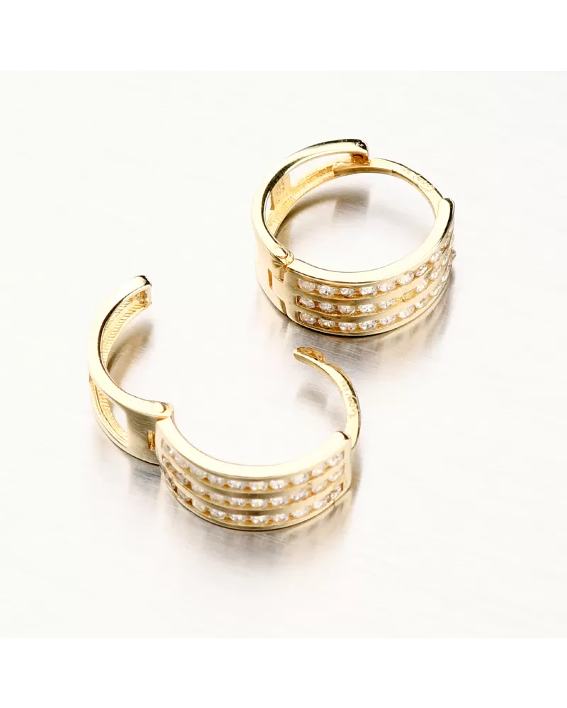 Zářivé zlaté náušnice kruhy s pevnou konstrukcí si zamilujete. Kroužky jsou praktické a velmi pohodlné a to je přesně to, co potřebujete. Tento model zdobí přední strana, která je zdobena třemi pruhy osazené zářivými zirkony v briliantovém brusu. Tento brus zajišťuje maximální brilanci vybroušených facet, dokonale odráží světlo a neuvěřitelně září z každého úhlu pohledu.