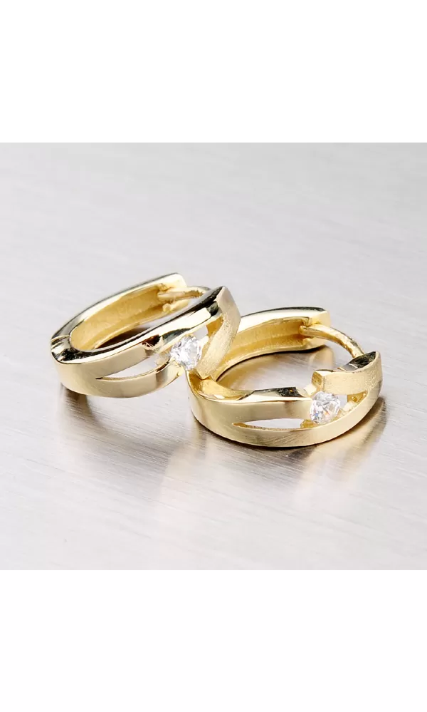 Elegantné dámske náušnice - krúžky s bielym zirkónom sú vyrobené zo žltého štrnástich karátového zlata 585/1000 v kombinácii lesklej a matnej povrchovej úpravy.