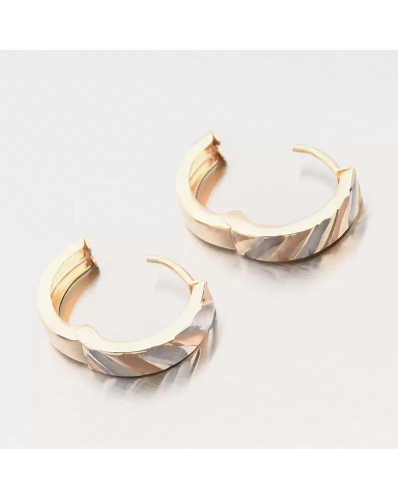 Náušnice jsou vyrobeny ze 14 karátového zlata o ryzosti 585/1000 ve žluté, bílé a růžové barvě zlata a v lesklé a matné povrchové úpravě. I když náušnice nemají žádné zirkony, jsou na první pohled zářivé a to díky nádherným a výrazným facetám, kterými jsou náušnice zdobeny na celé přední straně. Facety jsou v bílé, žluté a růžové barvě zlata. Facety jsou lesklé plošky dělané za pomocí diamantového hrotu a dodávají šperku maximální lesk a brilanci ze všech úhlů. Bílá a růžová část je v matné povrchové úpravě a žlutá část je v lesklé úpravě. Celá zadní strana náušnic je v lesklém a hladkém provedení ve žlutém zlatu. Je možné tedy náušnice nosit oboustranně podle vaší nálady.