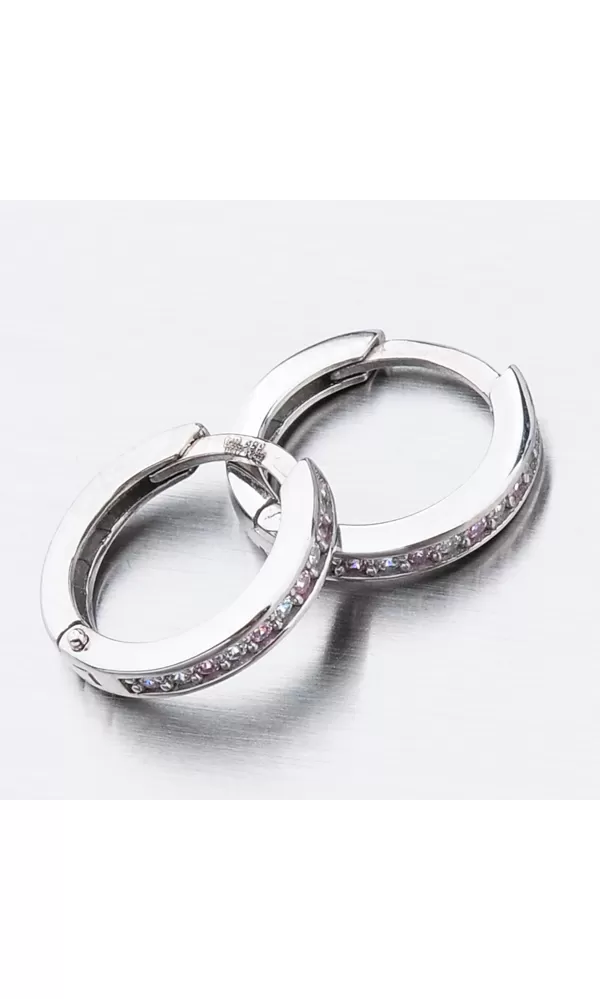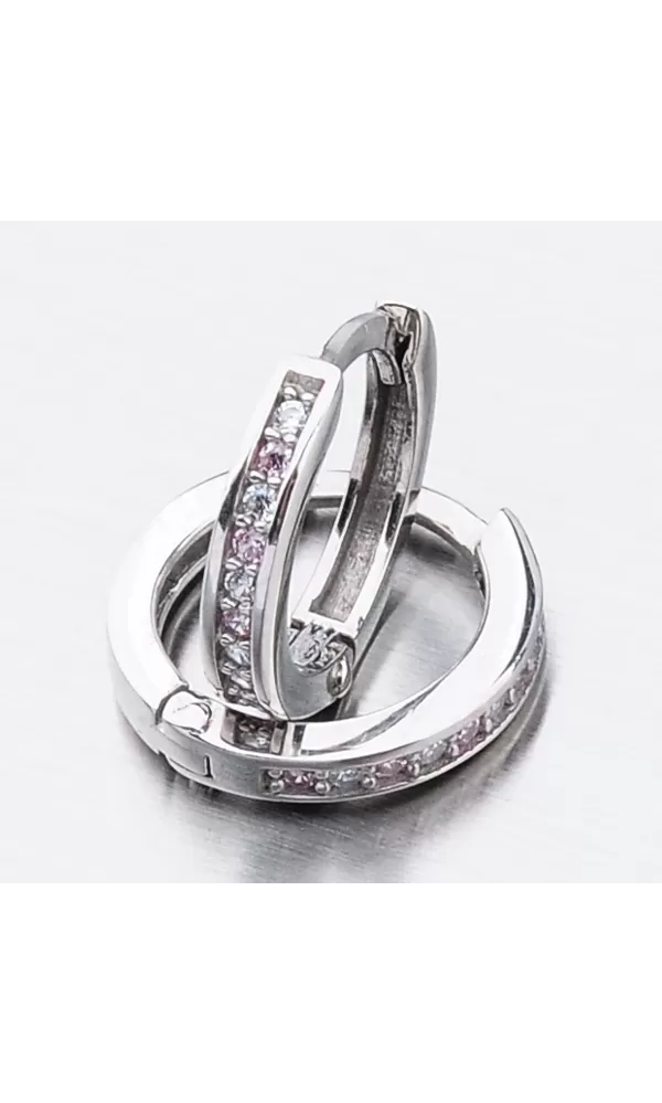 Něžné náušnice kroužky s pevnou konstrukcí si zamilujete vy i vaše malá parádnice. Kroužky jsou velice praktické a velmi pohodlné a to je přesně to co potřebujete. Tento model zdobí přední strana precizně osázená zirkony v briliantovém brusu. Zirkony se pravidelně střídají v růžové a bílé barvě. Zadní strana je hladká a pokud vaší princeznu zirkony omrzí dají se kroužky nosit i zadní stranou dopředu.