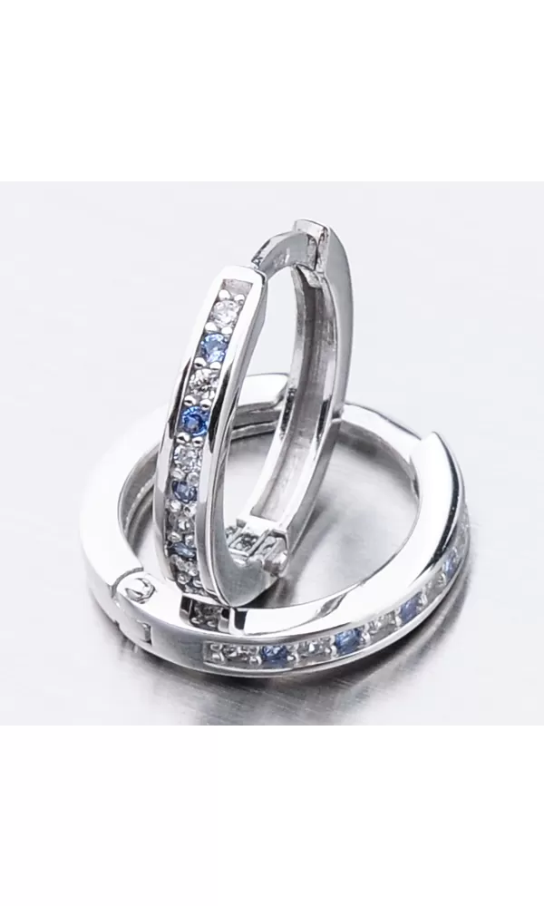 Něžné náušnice kroužky s pevnou konstrukcí si zamilujete vy i vaše malá parádnice. Kroužky jsou velice praktické a velmi pohodlné a to je přesně to co potřebujete. Tento model zdobí přední strana precizně osázená zirkony v briliantovém brusu. Zirkony jsou v kombinaci modré a bílé barvě. Zadní strana je hladká a pokud vaší princeznu zirkony omrzí dají se kroužky nosit i zadní stranou dopředu.