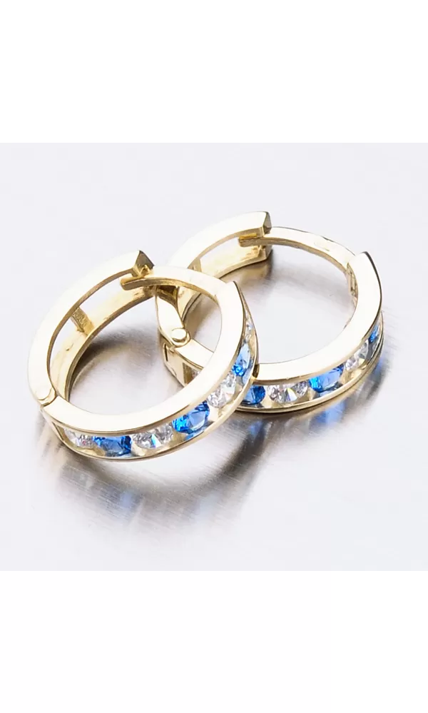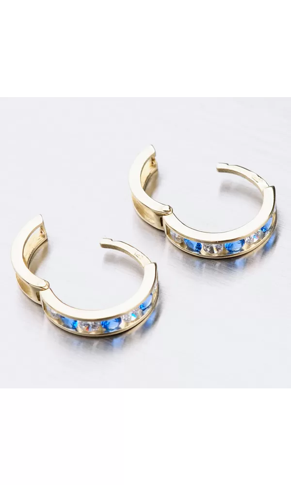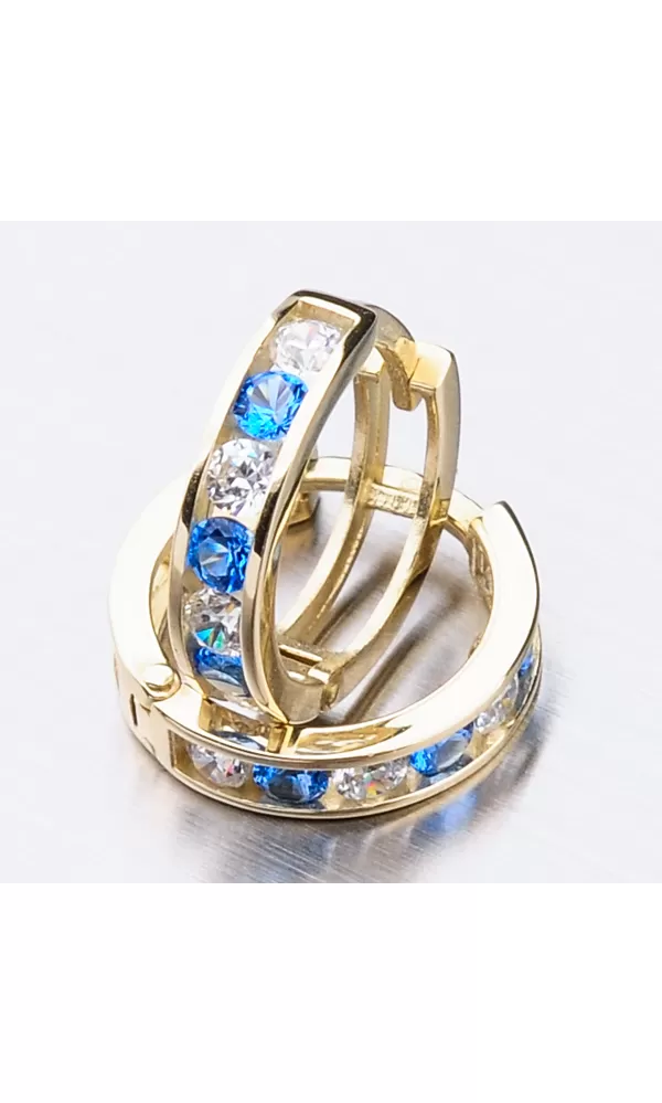 Něžné náušnice kroužky s pevnou konstrukcí si zamilujete vy i vaše malá parádnice. Kroužky jsou velice praktické a velmi pohodlné a to je přesně to co potřebujete. Tento model zdobí přední strana precizně osázená zirkony v briliantovém brusu. Zirkony se pravidelně střídají v modré a bílé barvě.