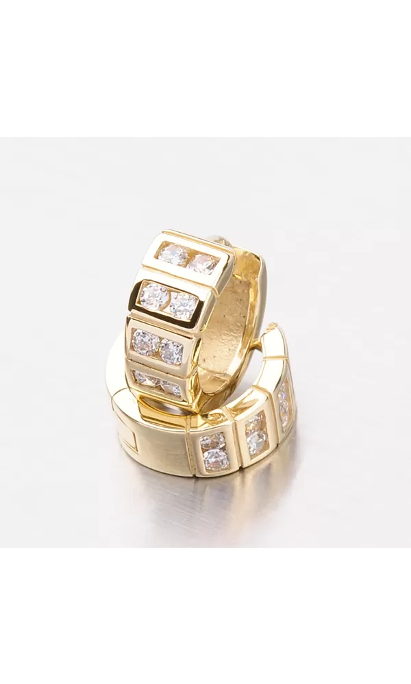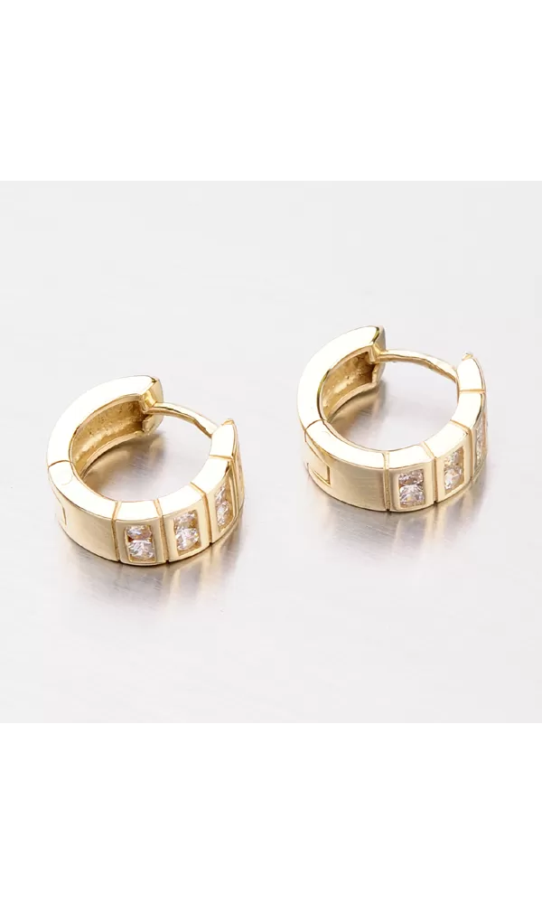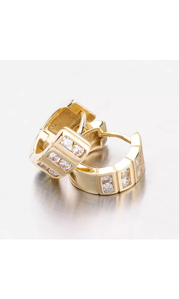 Krásne a elegantné náušnice vyrobené zo žltého štrnástich karátového zlata s rýdzosťou 585/1000 s lesklou povrchovou úpravou. Náušnice sa hodia na nosenie v bežný deň, ale aj do spoločnosti a zamiluje si ich každá slečna. Náušnice sa vďaka svojmu vzhľadu môžu nosiť oboch stranách a to buď stranou osadenou ôsmimi zirkónmi alebo lesklou stranou.