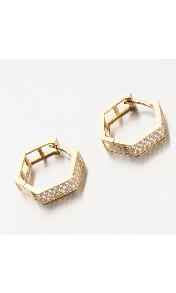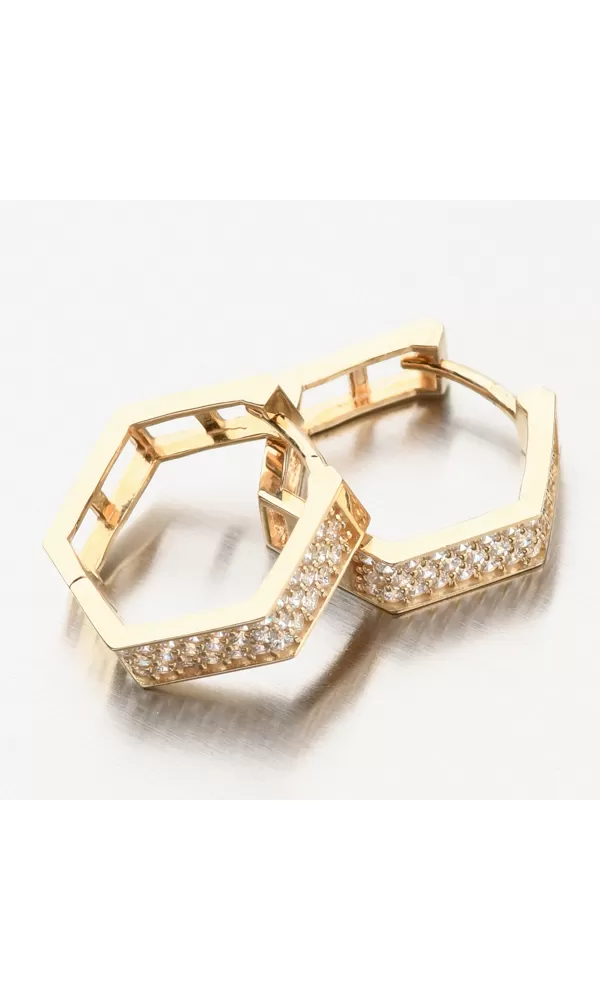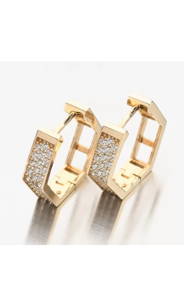Zářivé dámské náušnice vyrobené ze žlutého zlata o ryzosti 585/1000 Vás zaujmou svými čirými zirkony briliantového brusu a unikátním tvarem. Zirkony jsou ve třech řadách a dodávají náušnicím vysoký třpyt. Velikostí budou náušnice vhodné i pro malé slečny. Náušnice jsou nejen krásné, ale i praktické hlavně díky jednoduchému zapínání.