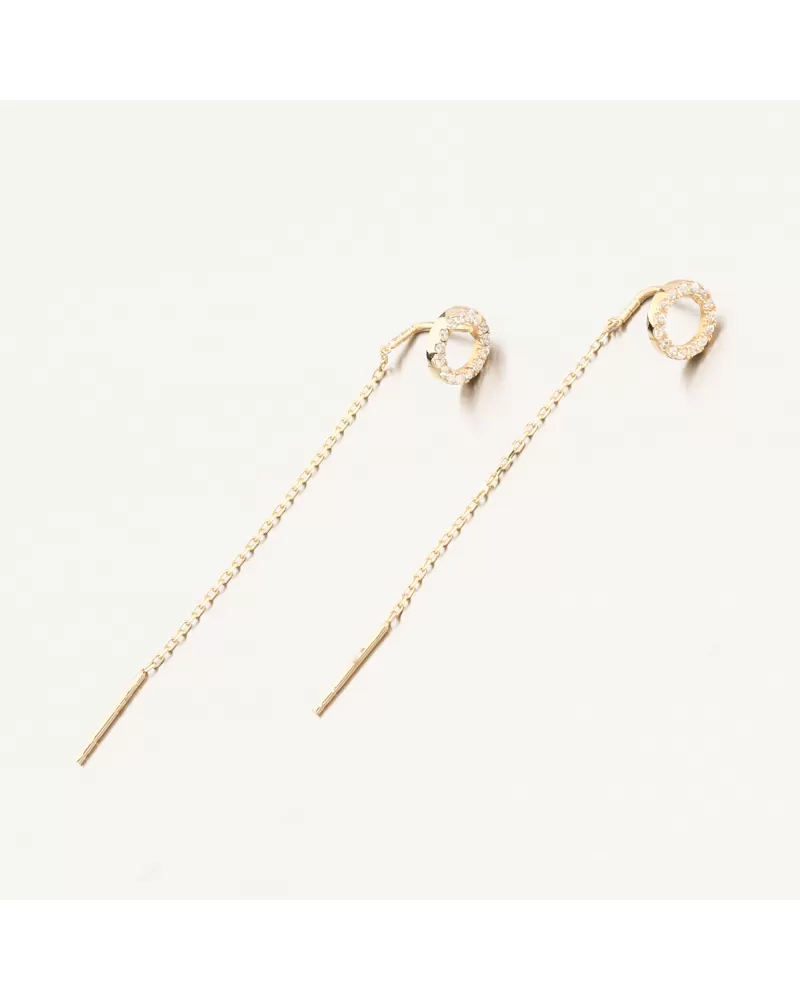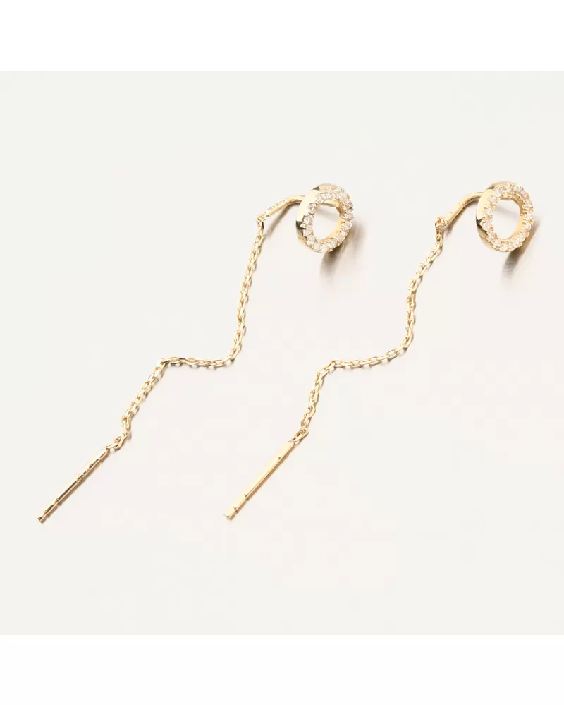 Objavte jemnú eleganciu v podobe týchto výnimočných zlatých náušníc. Kombinujú minimalistický dizajn s elegantným detailom v podobe kruhu osadeného trblietavými zirkónmi. Dlhý retiazkový prívesok vytvára pri nosení krásny pohyb a jemne predlžuje líniu krku. Náušnice sú ľahké a pohodlné, ideálne na celodenné nosenie a špeciálne príležitosti.