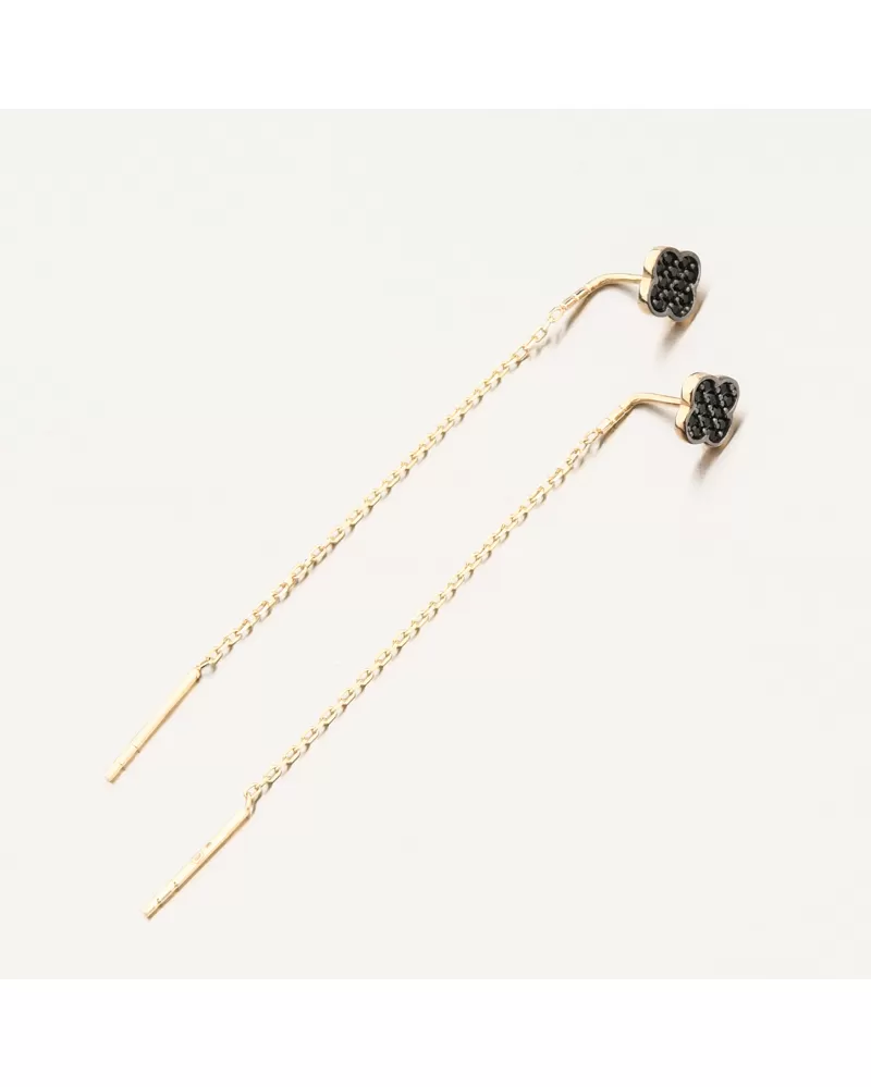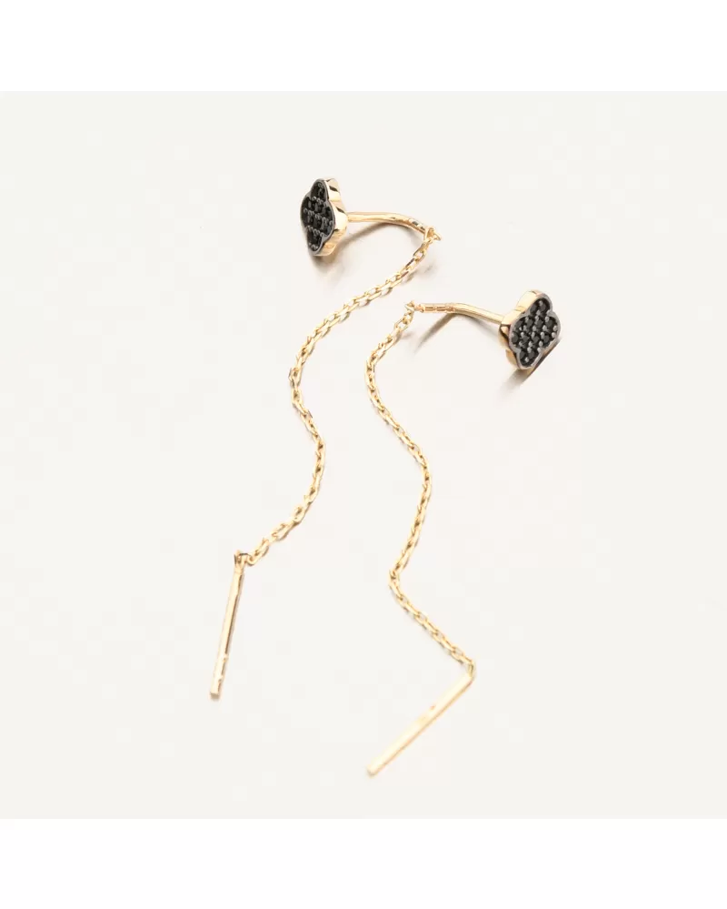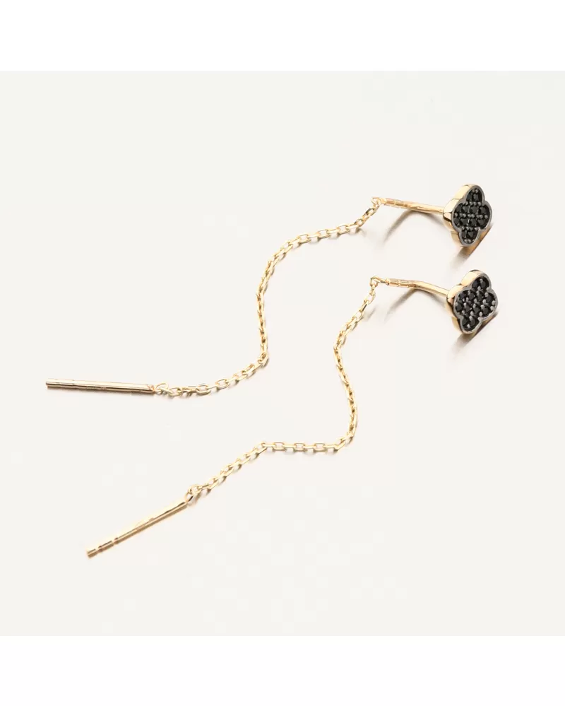Objavte jemnú eleganciu v podobe týchto výnimočných zlatých náušníc. Kombinujú minimalistický dizajn s nápadným detailom - malý čierny kvetinový motív osadený lesklými čiernymi kamienkami dodáva šperkom moderný a nadčasový vzhľad. Dlhý retiazkový prívesok vytvára pri nosení krásny pohyb a jemne predlžuje líniu krku. Náušnice sú ľahké a pohodlné, ideálne na celodenné nosenie a špeciálne príležitosti.