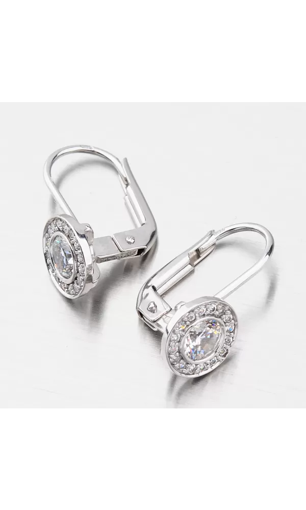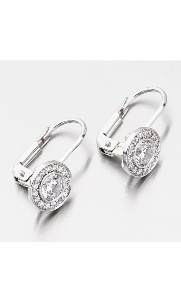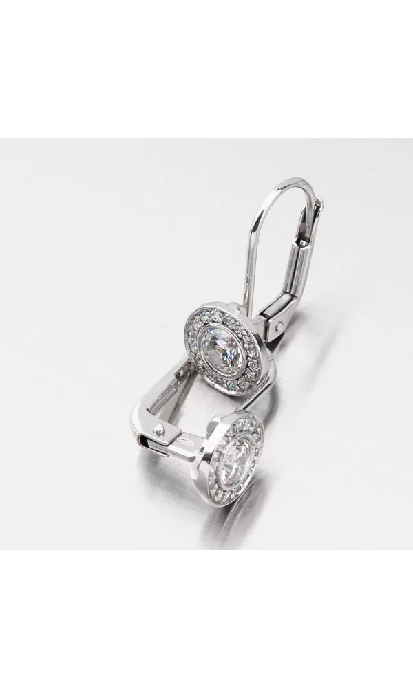Překrásné náušnice jsou zdobeny ozdobou v kulatém tvaru. Uprostřed kruhu je vsazen s maximální pečlivostí velký zirkon v briliantovém brusu a kolem něj jsou vsazeny menší neméně zářivé zirkony také v briliantovém brusu. Tento brus zirkonům dodává brilanci pravých diamantů. Pro maximální spolehlivost a bezpečí se náušnice zapínají na klapku.