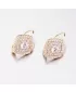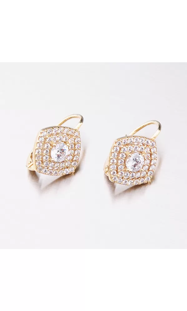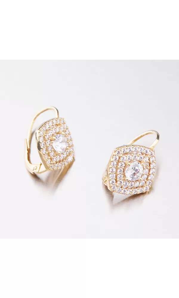 Luxusní dámské náušnice jsou zajímavé svou bohatě zdobenou ozdobou ve tvaru kosočtverce. Tato ozdoba je osázena zirkony v briliantovém brusu ve dvou řadách a uprostřed je vsazený jeden větší zirkon uchycený čtyřmi krapnami. Náušnice jsou pohodlné mají zaoblené strany a zapínají se na klapku, která je maximálně bezpečná. Ozdobte se luxusním šperkem, který vás bude dokonale reprezentovat.