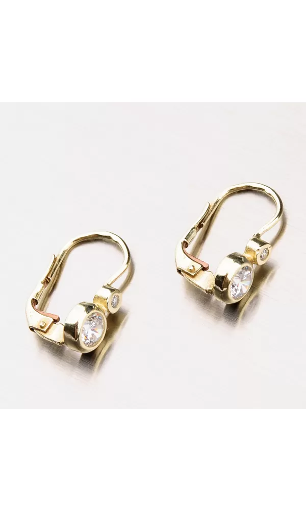 Jednoduché dámske zlaté náušnice, zdobené jedným veľkým bielym zirkónom a jedným menším, sú vhodné na každodenné nosenie. Dámske náušnice vyrobené zo… Celý popis
