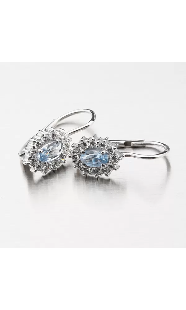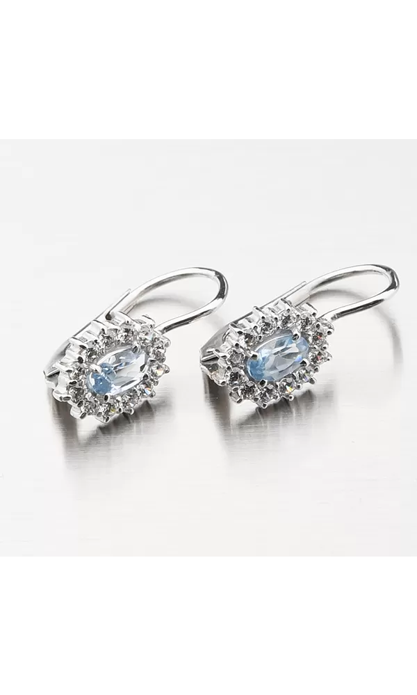 Dámske náušnice s oválnymi modrými syntetickými akvamarínmi, ktoré sú dookola vysadené bielymi zirkónmi sú vyrobené z bieleho štrnásťkarátového zlata 585/1000 v lesklej povrchovej úprave. Náušnice sa zapínajú na klapku.